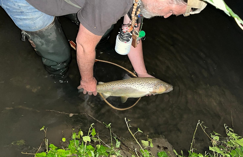 | Ein weiterer Vorteil bei der Fischerei im Dunkeln: die Fische sehen einen schlechter. Erst neulich stand ich unter einer Fußgängerbrücke im Schatten der Laterne. Ich watete dorthin in Zeitlupe direkt durch den Pool, anders kommt man dort unauffällig nicht hin. Von Oben müsste ich durch den von der Laterne erleuchteten Bereich waten. So stand ich dann unter der Brücke, der Bach an der Stelle nur vielleicht 6m breit, und hörte, während ich meine Maifliege bachaufwärts nur um Rutenlänge in den Schein der Laterne schlenzte, hinter mir einen guten Fisch steigen. Wir befanden und noch in der Hochphase der Danicas und die Forellen stiegen noch gut darauf ein. Ich schaute nach unten, konnte aber im Schatten nichts mehr erkennen. Keine zwei Minuten später nimmt ein starker Fisch meine Maifliege direkt vor meinen Füßen. Die Bachforelle war so baff wie ich, doch ich reagierte blitzschnell und kescherte sie, bevor der große Tanz los ging. Allerdings war sie dadurch so vital, dass sie mir beim Abschätzen der Länge, ich habe Markierungen am Kescher, aus der Hand hüpfte. Ich schätze sie auf ca. 54cm. |