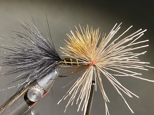 Als Köder für die geschlitterte Fischerei haben sich große, kräftige Muster bewährt. Eine große, gut schwimmende Caddis funktioniert meistens gut, ebenso Nachfalter Imitationen aus Foam, kleine Mausmuster, die Tschernobyl Ant oder die aus der Mefo Fischerei bekannte „Zigarre“. Zur aktiven Fischerei benutze ich auch gerne dieses Muster, aus Marabu, Foam und Deerhair (siehe Bindeanleitung weiter unten). |