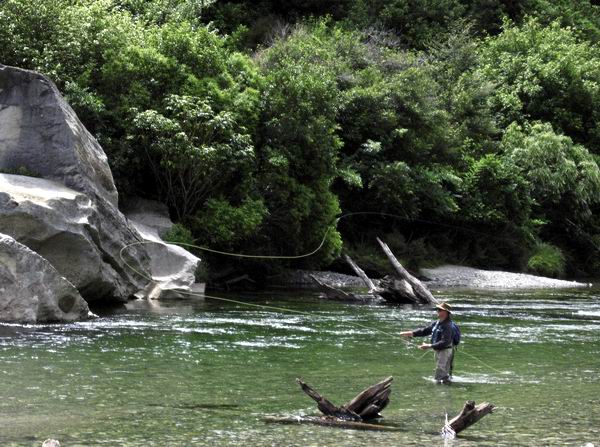 In meinem Gewässerverzeichnis der neuseeländischen Südinsel (South Island Trout Fishing Guide, von John Kent) sind 600 vielversprechende Flüsse verzeichnet. All diese Flüsse (und alle Gewässer der Nordinsel!) darf man mit einer einzigen Lizenz, die man für 92 NZ$ (= 50 Euro) bekommt, 7 Monate im Jahr uneingeschränkt befischen. Zum Beispiel von Omarama aus, ein Ort, der um eine auffällige Forellenskulptur herum nur aus zwei Tankstellen, einem Motel und einem Restaurant gebaut ist, kann man an den Hängen der „Südalpen“ in 13 verschiedenen Traumgewässern fischen. Tausende von verlockenden, in aller Ursprünglichkeit fließende Gewässer gibt es auf der Südinsel von Neuseeland. Und alle Flüsse haben einen natürlichen Bestand von Bachforellen, die schon im vorletzten Jahrhundert in diesen Gewässern angesiedelt worden sind. Wo sollen wir morgen fischen? Eine Frage, die ich mir mit Hans und anderen fishing mates oft und ohne jede Koketterie stelle. |