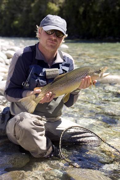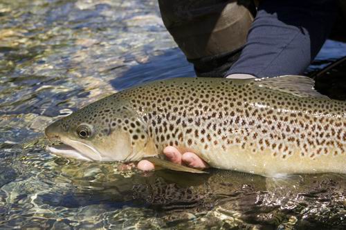 Auch in mich kommt wieder Leben. Alle Gliederschmerzen sind vergessen. Mit Kescher und Fotoapparat laufe ich zu Hans und fotografiere wie er seinen Fisch drillt und dann erfolgreich landet. Es folgt das obligatorische Trophäenbild und mit „Thank you, Mr Trout!“ wird der Fisch wieder in den Fluss entlassen. |