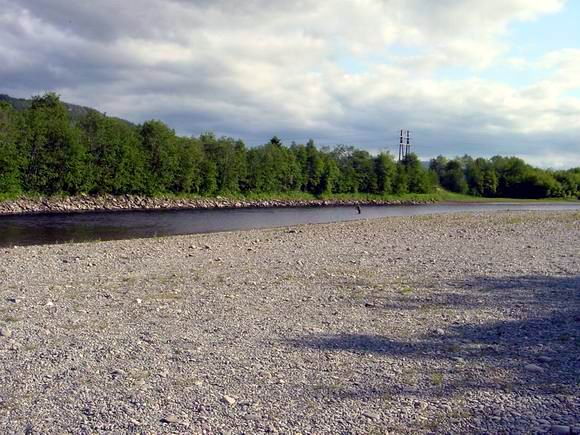 Die Orkla, Pool "Bakka", kurz vor der Mündung. Niedrigwasser, Wärme und zu zeitig im Jahr vor Ort: schlecht für den Lachsfischer :-( Gelegentlich zeigen sich Fische - nur beissen will keiner... Foto und Copyright: Michael Müller |