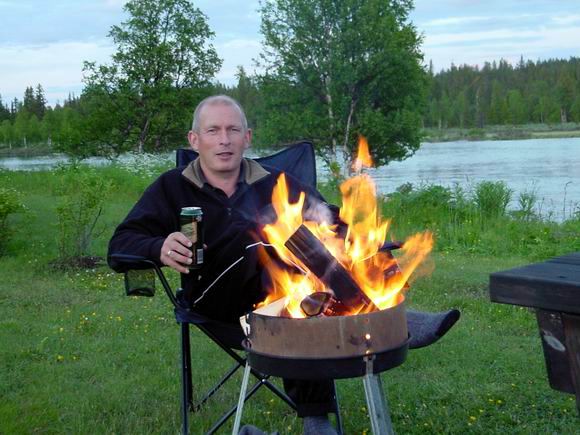 Lutz am Ufer des Vindelälven. Mit geflegtem Bier und am ebenso gepflegten Feuerchen - so, wie er es am Liebsten hat :-)
