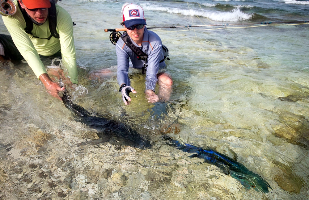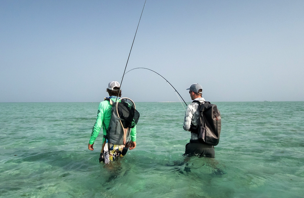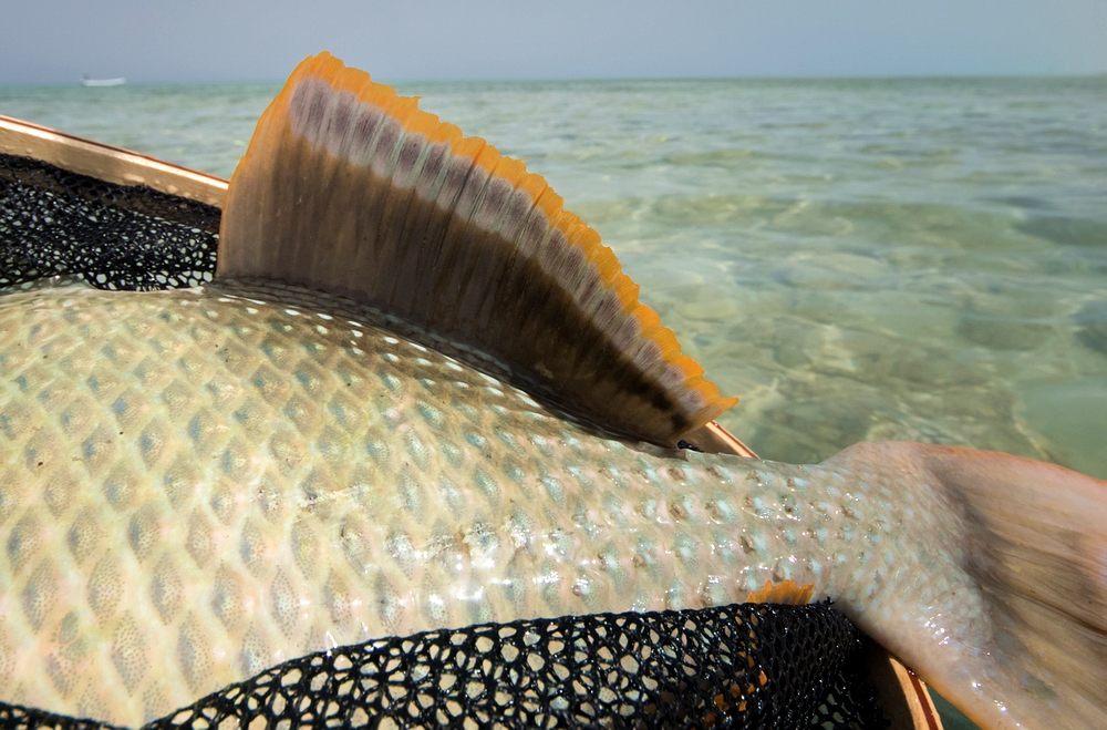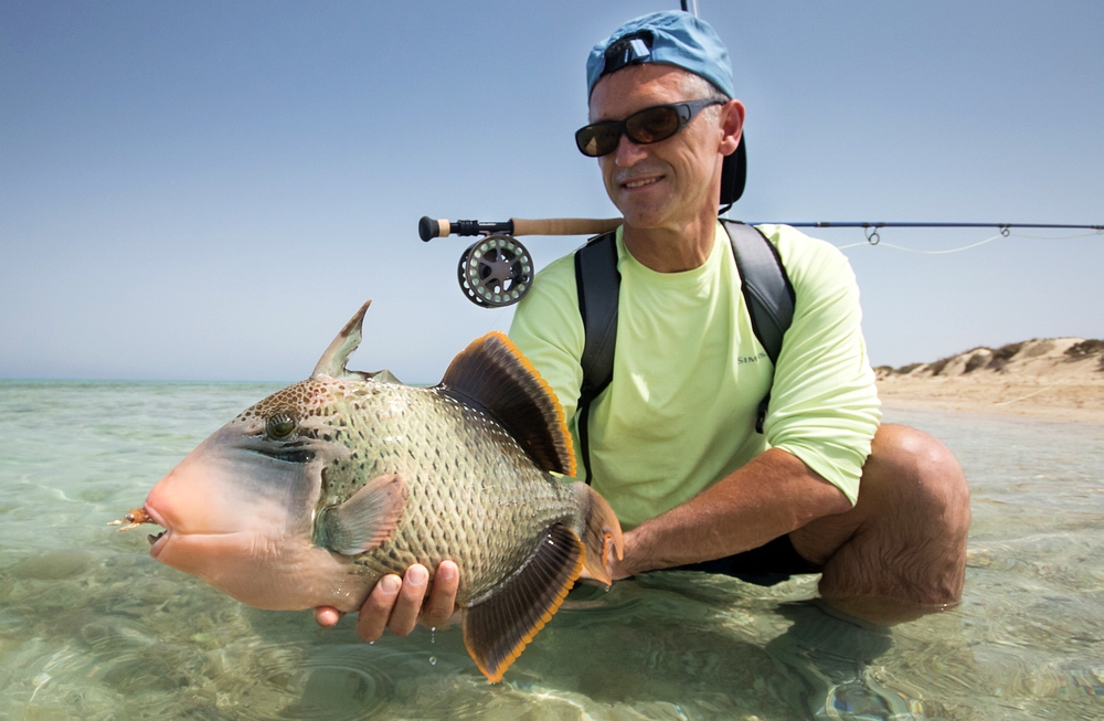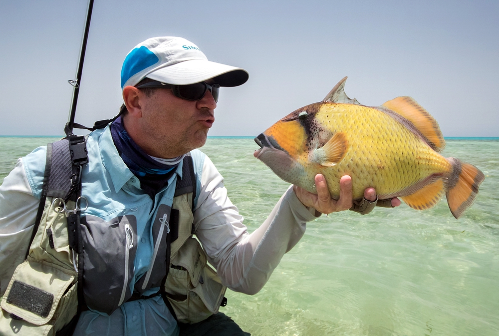 Kurze Zeit später kann ich den nächsten starken Titan Triggerfish haken. Selbst gespottet und sauber angeworfen – und wieder geht der Fisch entgegen aller Manier aggressiv auf die Fliege los, schon beim Einstrippen. Der Haken sitzt, der Drill geht gut und nach einer Weile kann ich den wunderschönen farbenprächtigen Fisch landen – und nach einigen Fotos vom Guide wieder releasen. Herrlich, vor der Kulisse des in allen Blautönen schimmernden Flats und der bizarren Insel mit ihren verschiedenen Ockertönen im Hintergrund. Auch die Kollegen machen an diesem Vormittag ihre ersten Trigger-Erfahrungen, mit negativen und positiven Resultaten. |