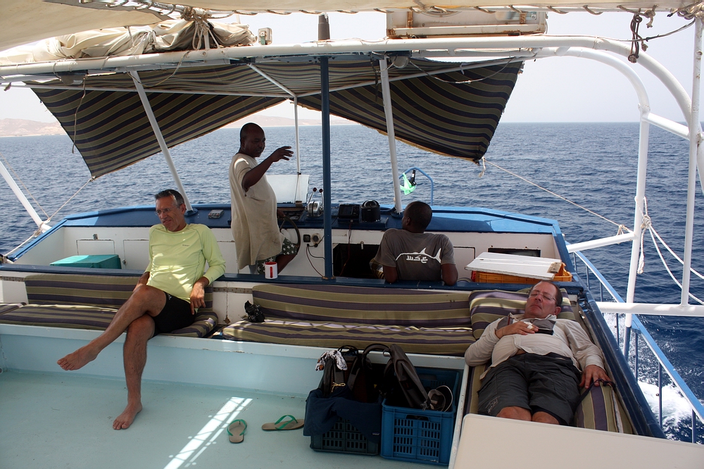 Ein feiner Schleier aus Wüstensand steht wie eine dunstige Glocke über der staubtrockenen Ebene und sorgt für diffuses Licht. Seit über zwei Stunden sind wir auf der küstennahen Rumpelstraße unterwegs und der Nachmittag neigt sich langsam seinem Ende entgegen. Bei bulligen 38°C sind wir in Port Sudan aufgebrochen, um die 160 Kilometer nach Norden zum Liegeplatz unseres Mutterschiffes zu fahren, welches uns für die kommende Woche beherbergen soll. Unser Transportmittel dorthin ist ein arg in die Jahre gekommener Toyota Kleinbus, als Klimaanlage dienen offene Fenster und Gardinen. Die Eindrücke während der Autofahrt sind schlichtweg beeindruckend. In diesem nördlichen Teil des islamischen Sudan treffen schwarzafrikanische und arabische Kulturen aufeinander. In den kleinen Ortschaften am Weg blüht ein vielfältiges Kleingeschäftsleben. Auf bunten Märkten und direkt vor der Haustür wird mit allem gehandelt, was sich irgendwie handeln lässt, Wasser, Benzin, Esswaren, Gewürze, Getränke, Haushalts- und Baukram, Kfz-Teile, Schrott… Überall stehen, sitzen und liegen die Sudanesen, teils in weiße Umhänge gehüllt, teils in weltlicher Bekleidung und bringen so den lieben langen Tag herum. Frauen und Kinder sehen wir jedoch nur selten. |