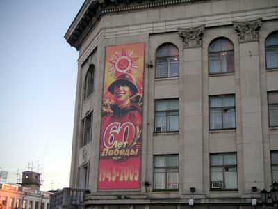 nehmen wir ein (japanisches?) Bier in einem der Straßencafes ein. Nastia lernt gerade deutsch und kann englisch sprechen. So erfahren wir einiges über die Stadt, Land und Leute. Außerdem waren unsere Österreicher Hannes und Gerhard, wie eingangs erwähnt, bereits drei Tage hier und wissen einiges zu erzählen. Einige Dinge fallen uns besonders aus: Fast alle PKW haben das Steuer auf der rechten Seite, da die meisten Gebrauchtwagen aus Japan importiert werden. In Russland herrscht jedoch Rechtsverkehr – wie bei uns. Von zahlreichen Hausfassaden leuchten uns riesige Banner entgegen, die den Jahrestag zu 60 Jahre Sieg und Befreiung anpreisen (1945–2005). |