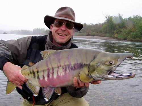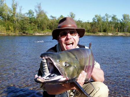 | Nach Auskunft von Robert Wetzel in der Lodge erwartet uns eine erstklassige Fischerei. Es herrscht Niedrigwasser und der Fluss ist klar und voller Lachse. Die Buckellachse sind bereits durch aber es befinden sich viele Hundslachse (Ketalachse) im Fluss und der in diesem Jahr verspätete Haupt-Run der Silberlachse ist jetzt in vollem Gange. Am Fluss sind diese hervorragenden Tatsachen schwer zu übersehen: man kann Schwärme von Lachsen sehen, es klatscht, platscht und buckelt überall. | ![]() |