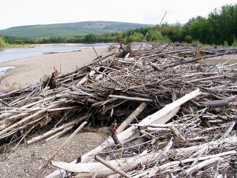 04.09.: Sehr zeitig Frühmorgens ertönt plötzlich eine tierische Busch- und Wecktrommeleinlage. Das kann doch nur DER Willi sein... der hat vermutlich die gelagerten, leeren Benzinfässer entdeckt... Letzter Fischtag. Strahlend blauer Himmel ohne die kleinste Wolke. Erleben heute Vormittag noch mal eine erstklassige Fischerei, etwas rechts unterhalb der ersten Beats stromabwärts – ein etwas abseits liegender Ort, an dem in diesem Jahr wohl noch niemand fischen war? Ich versuche, den einmündenden Keta-Laichfluss etwas stromaufwärts zu erkunden, der voller Lachse ist. Was tut man |