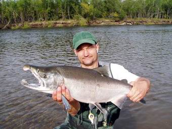 ebenfalls schnell wieder frei kommen. Im Hauptfluss auf der Linken seit geht es sehr viel besser. Im vorderem Bereich an der Strömungskante haben sich viele Keta- und Silberlachse aufgereiht. Man kann sie an diesem warmen, sonnigen Vormittag sehr gut sehen und gezielt anfischen. Ich kann einige Fische direkt auf Sicht fangen, herrlich!!! Mittags gibt es eine Lachsklösschen- Vorsuppe und Schweinegulasch mit deftigen Kraut und Paprikagemüse. Anschließend heißt es wieder Filets waschen, trockenreiben, lochen, mit Haken versehen und den Räucherofen ein letztes mal bestücken. Wir fischen heute Nachmittag ein letztes mal am |