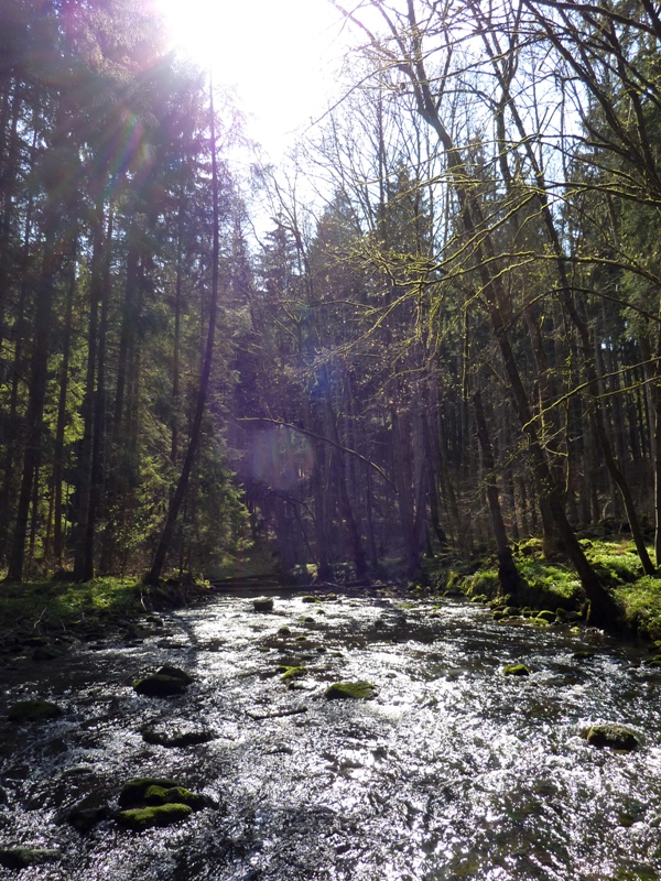 Die Wasser des Odenwaldes sind natürlich und wild. Kleine, schnelle Flüsschen mit selten mehr als 6 Meter Breite sprudeln Richtung Neckar, Main oder direkt zum Rhein hin. Dabei graben sich insbesondere die östlich gelegenen Fließgewässer tief in den Buntsandstein ein und erzeugen ein feinkiesiges und sogar sandiges Gewässerbild. Viele dieser Perlen liegen tief im Wald versteckt. Das Wasser ist glasklar und strotzt vor Leben. Der Insektenreichtum am Grund ist zum Teil so groß, dass man beinahe schon auf jeden seiner Schritte achten muss. Doch nicht nur das Insektenleben ist bemerkenswert, auch die Flossenträger leben hier „wie Gott in Frankreich“. Die gute Ernährung sieht man den Forellen deutlich an: Sie leuchten in einem dunklen Gold, die Flossen sind perfekt gewachsen und in ihrer schwarz-roten Tupfenzeichnung könnten die Forellen kaum schöner sein. |