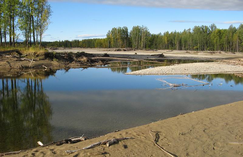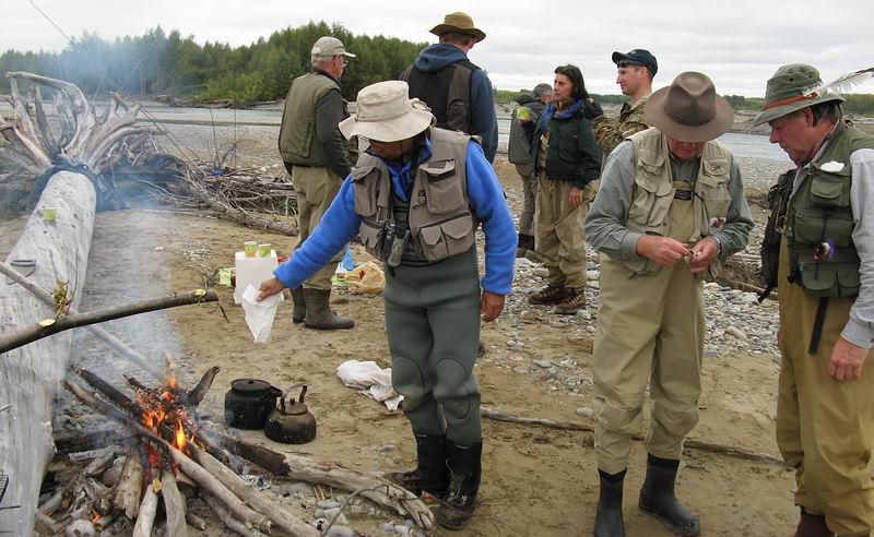 Es dauert nicht lange, bis auch fast die letzten herausgefunden hatten, wie sie aus dem Aufzug von Tausenden und abermals Tausenden vorbeiziehender Fischen die gewünschten Exemplare herausfischen konnten. Beim Essen der Suppe, die Olga uns zum Mittag am Lagerfeuer zubereitet hat, sehe ich ein unruhiges Gesicht. “Gleich fischen wir mal zusammen” sag ich zu ihm. Ich kenne eine Stelle, wo jeder Lachse fängt. Wir gehen ein Stück zu Fuß und durchqueren watend drei Seitenströme. An einem dieser ziehen Unmengen von Hundslachsen durch eine untiefe Rinne, über deren Nacken mit viel Lärm, na ja, viel Schwung, über den Kies, zur nächst höheren, tieferen Stelle. Gerade als er mir sagt, er hätte Angst vor Bären, sehe ich schräg hinter uns, gegenüber einer Insel, eine Bärin mit ihrem Jungtier, eben dort, wo soeben sich die Lachse hoch gekämpft hatten. Ohne etwas zu sagen, laufen wir ein Stückchen weiter bis zum Waldrand an der nächsten Insel. |