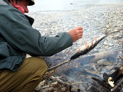 Nach dem Essen wird diese “Vorfischerei” nochmals in der Gruppe besprochen. Danach werden alle Campeinrichtungen erklärt und für den nächsten Tag wird das Fischen und Essen koordiniert eingeplant. Schließlich wollen ja einige schon beim ersten Tageslicht und andere wiederum erst um 8-9 Uhr zum Fischen gehen. Und da sollen ja die "Urlaubsfischer” nicht an eine Stelle geraten, die schon einige Stunden vorher intensiv befischt worden war… <= Manik mit Äsche |