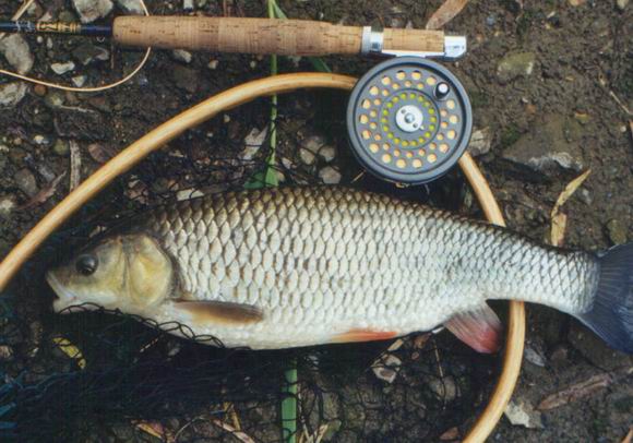 ...anbei ein dicker Döbel, der in meinem Hausgewässer, der Innerste, auf eine Trockenfliege ("Tricolore") hereingefallen ist!