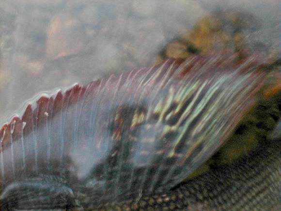 Eine "Unterwasseraufnahme" der farbenprächtigen Fahne einer 49er Äsche aus dem schwedischen Ljusnan im Oktober 2004.