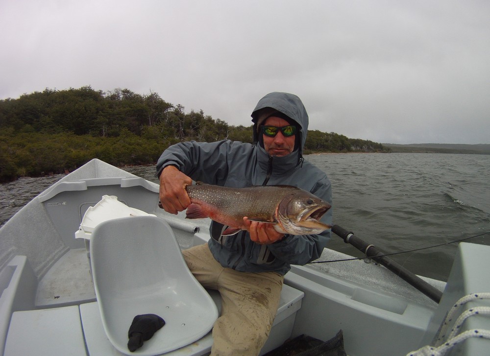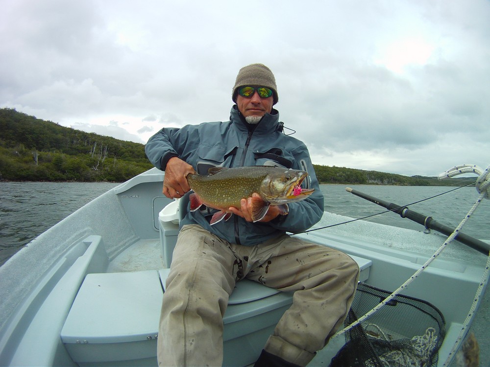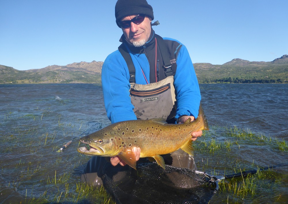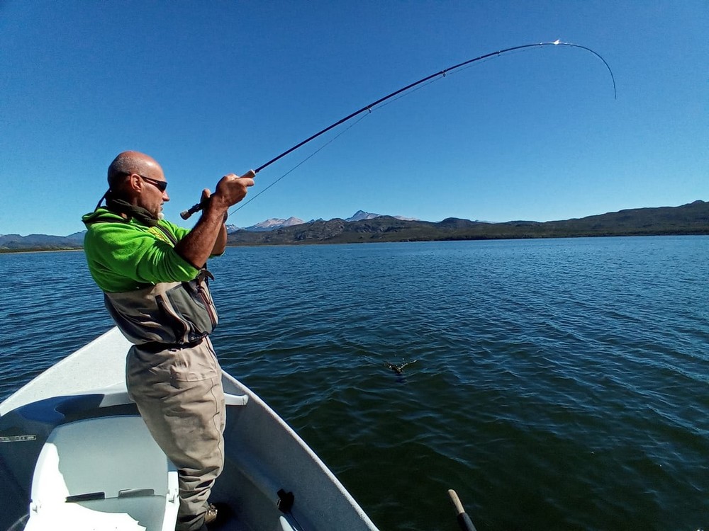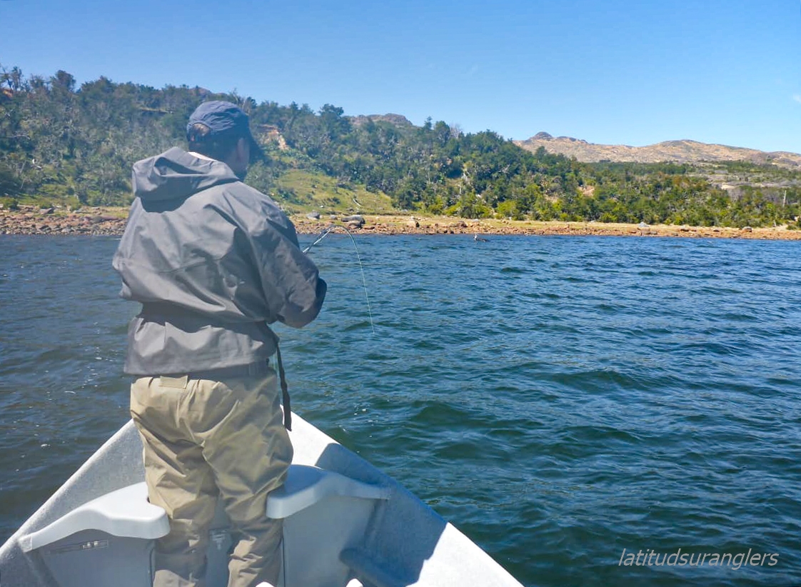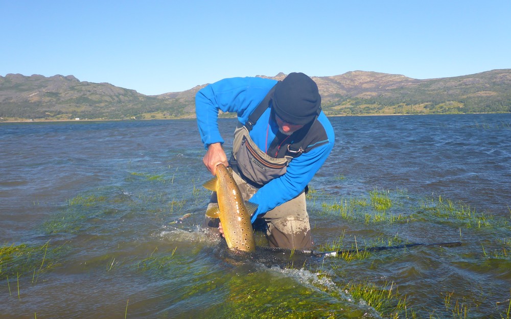 Der Meister allerdings ist nicht zufrieden! Seine Schnur, generell unsichtbare Linien pittoresker Schönheit in den wolkenlosen patagonischen Himmel zaubernd, würde bei dieser Position weit über das vermeintliche Ziel hinausschießen! Ay, Ay Käptn, dann also das Boot verholen, Raum schaffen für einen Caster, von dem ich mir gerne etwas abschaue. So mit einem gemeinsamen Konsens, entere ich den Bugbereich, einfach herrlich entspannt, die Werferei von hier, während ich das Meckern von hinten höre. Biß! Des Meisters Gerte neigt sich, die Rolle surrt, während dem ich meine eigene Fliege aus dem Wasser kurbele, um Hilfestellung zu geben. Da geht was! Immer wieder die Hand vom Rollenrand lösend, zieht der Fisch nach dem obligatorischen Sprung in die Tiefe, eine stattliche Bachforelle hat die tief geführte Fliege genommen und tobt sich im Freiwasser aus. Nach knackigem Drill liegt