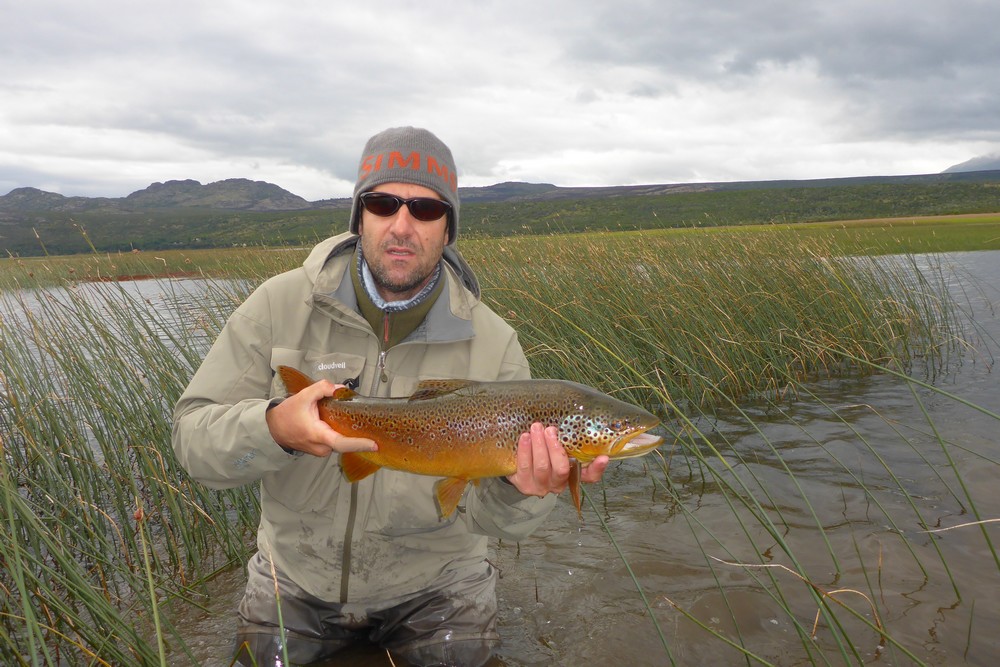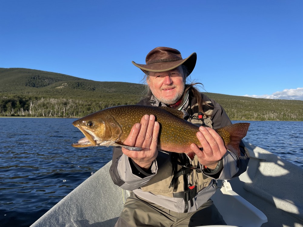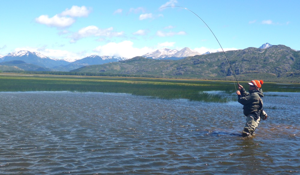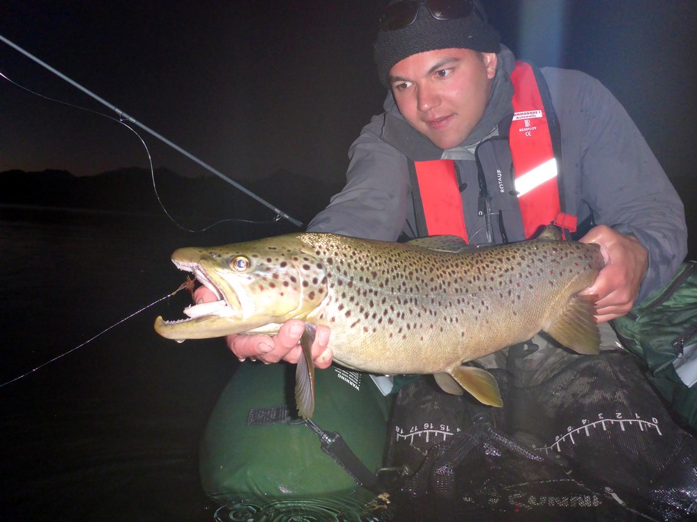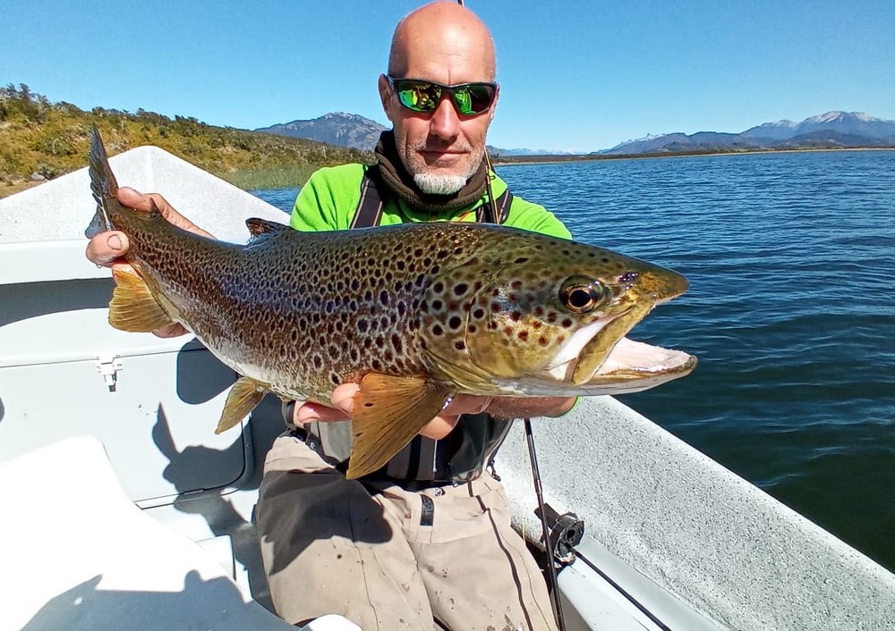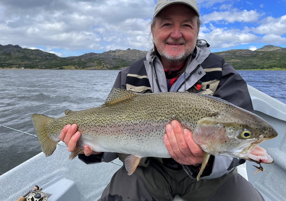 Der Meister allerdings ist nicht zufrieden! Seine Schnur, generell unsichtbare Linien pittoresker Schönheit in den wolkenlosen patagonischen Himmel zaubernd, würde bei dieser Position weit über das vermeintliche Ziel hinausschießen! Ay, Ay Käptn, dann also das Boot verholen, Raum schaffen für einen Caster, von dem ich mir gerne etwas abschaue. So mit einem gemeinsamen Konsens, entere ich den Bugbereich, einfach herrlich entspannt, die Werferei von hier, während ich das Meckern von hinten höre. Biß! Des Meisters Gerte neigt sich, die Rolle surrt, während dem ich meine eigene Fliege aus dem Wasser kurbele, um Hilfestellung zu geben. Da geht was! Immer wieder die Hand vom Rollenrand lösend, zieht der Fisch nach dem obligatorischen Sprung in die Tiefe, eine stattliche Bachforelle hat die tief geführte Fliege genommen und tobt sich im Freiwasser aus. Nach knackigem Drill liegt