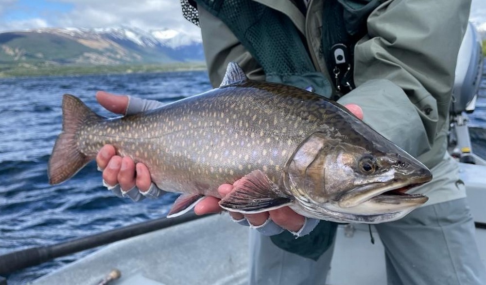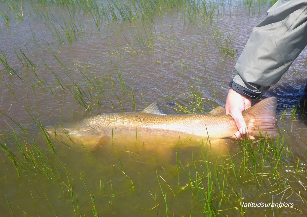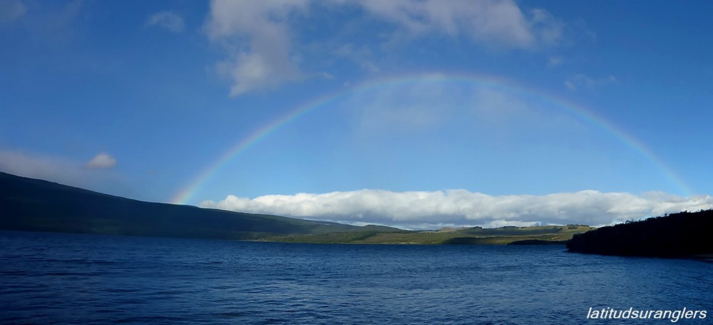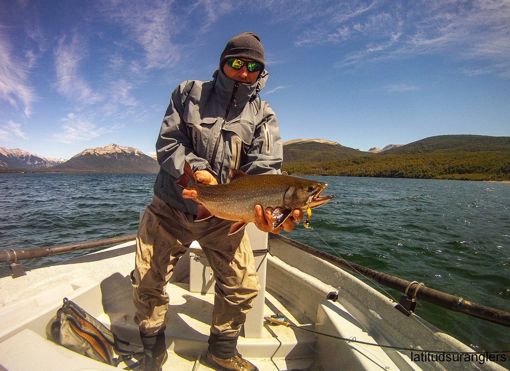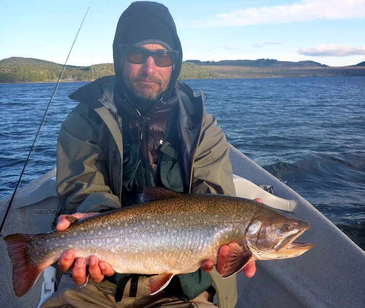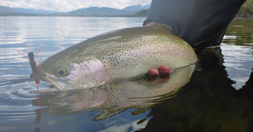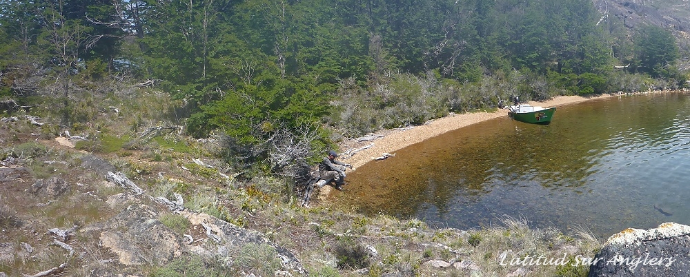 Der Meister allerdings ist nicht zufrieden! Seine Schnur, generell unsichtbare Linien pittoresker Schönheit in den wolkenlosen patagonischen Himmel zaubernd, würde bei dieser Position weit über das vermeintliche Ziel hinausschießen! Ay, Ay Käptn, dann also das Boot verholen, Raum schaffen für einen Caster, von dem ich mir gerne etwas abschaue. So mit einem gemeinsamen Konsens, entere ich den Bugbereich, einfach herrlich entspannt, die Werferei von hier, während ich das Meckern von hinten höre. Biß! Des Meisters Gerte neigt sich, die Rolle surrt, während dem ich meine eigene Fliege aus dem Wasser kurbele, um Hilfestellung zu geben. Da geht was! Immer wieder die Hand vom Rollenrand lösend, zieht der Fisch nach dem obligatorischen Sprung in die Tiefe, eine stattliche Bachforelle hat die tief geführte Fliege genommen und tobt sich im Freiwasser aus. Nach knackigem Drill liegt