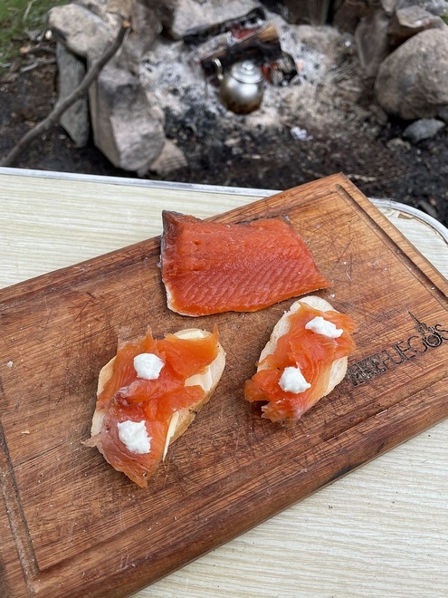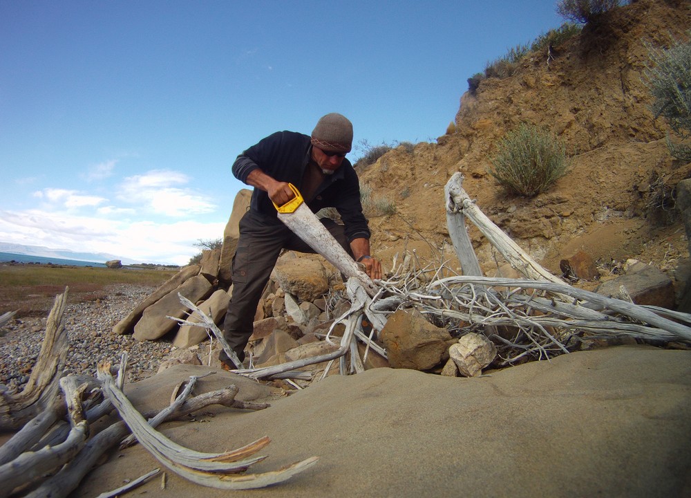 Kettensäge? Nein, Fuchsschwanz! Die Zeit nehme ich mir, immer, um jederzeit genügend Feuerholz zur Hand zu haben. Denn der Gaskocher bleibt so lange außer Betrieb, wie es das Klima zulässt: Kein Regen heißt dann generell auf dem offenen Feuer zu kochen. Dieses archaische Artefakt ist mein ständiger Begleiter an den verschiedensten Lagerplätzen, ein anspruchsvoller! Ohne Glut gibt es nun einmal keinen morgendlichen Kaffee und ohne Flamme keine warmen Füße nach einem langen Tag im kalten Wasser. Wer wenig Erfahrung mit Wind