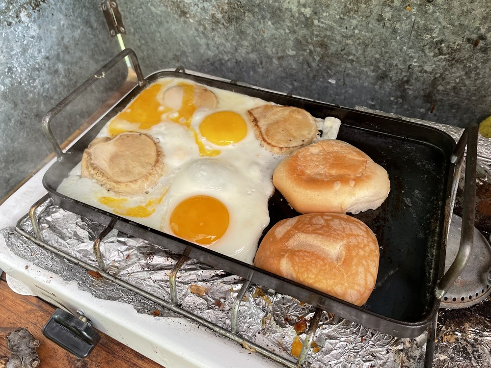 mit dem essenziellen: Frisches Brot, deftiges für den Grillrost, Eier
