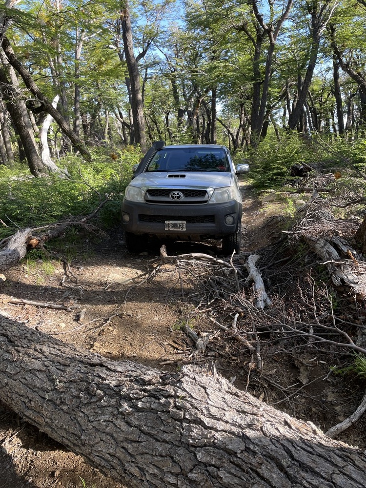 Ich nähere mich der Wegbiegung, wo herum? Zu einer Seite heißt womöglich noch keinen Zugang zu einem schönen Lagerplatz zu finden oder zumindest zusätzlich zum unabdingbaren Allrad, den Weg zu präparieren. Die andere Richtung verspräche mit dem naheliegenden Fließgewässer noch mehr Abwechslung. Egal, no risk no fun, denke ich mir und gerate bald, trotz patagonischer Spätwintertemperatur, mächtig ins Schwitzen: Die Bäume müssen halt aus dem Weg! Die alten Nothofagus, viele derer mehrere hundert Jahre alt, gefallen während des strammen Windes, woanders auf der Welt Sturm genannt, versperren den Zugang zum Lagerplatz. Und nein, das Driftboot habe ich wohl wissend zurückgelassen. Ja, die Möglichkeit, auch hier das ein und andere entlegene Gebiet mit dem 4x4 erreichen zu können, besteht. Es sind die verwachsenen Viehpfade, ausgeholzt und einigermaßen benutzbar gemacht vom Landbesitzer, dessen „Permiso“ ich habe, diese auch zu befahren. |