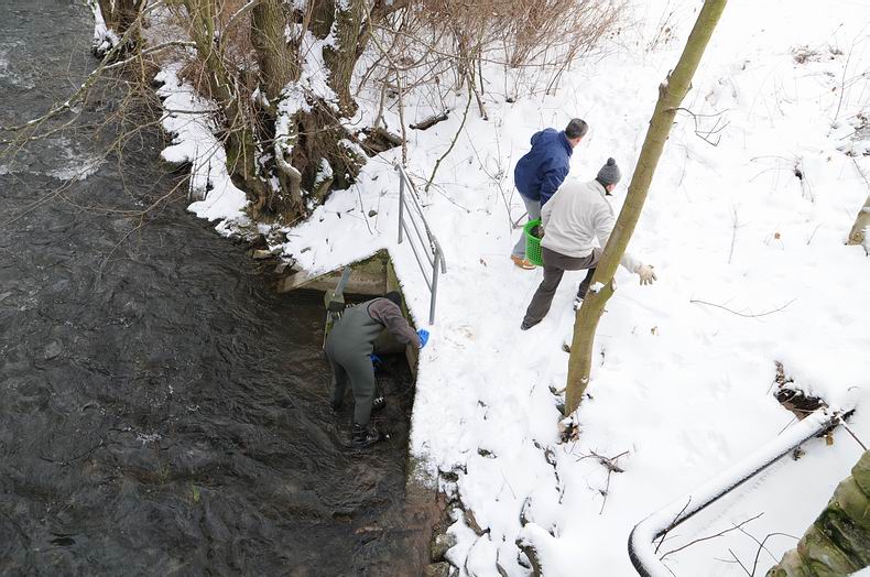 Pünktlich 09:00 standen die anderen Angelfreunde der“ Ilmtal Fliegenfischer“ an der Sportplatzbrücke bereit. Auch sie hatten schon ihre Vorbereitungen getroffen, indem sie mehrere Säcke Kies und große Steine aus der Ilm geholt hatten. Zum Glück waren die Außentemperaturen an diesem Morgen bei angenehmen -3°C, wenige Tage vorher waren es noch -18°C und da macht das Arbeiten im und am Wasser nicht unbedingt Spaß. |