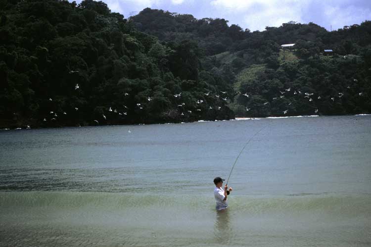 Die Küste steigt senkrecht auf weit über hundert Meter an. Schroff, zerklüftet und vollständig bewaldet. Fregattvögel segeln in den Aufwinden. Eine Lederrückenschildkröte zeigt sich, posiert kurz für ein verwackeltes Foto und taucht schnell wieder ab. Wir ankern in einer zauberhaften Badebucht, wo wir eine Pause einlegen. Am Strand gibt es Speisen, Getränke und handgebastelte Andenken. Hier gibt es wohl häufiger mal Besuch von Touristen. Kein Wunder, denn der Sand ist fein wie Puderzucker, das Wasser kristallklar und der Hain aus Kokospalmen könnte "karibischer" nicht sein. Ich gebe David einen Schnellkurs im Fliegenfischen. Er lernt schneller, als ich es ihm erklären kann. Am Nachmittag "jumpe" ich einen Vierzig- und einen 60-Pfünder. (To jump a Tarpon = der Fisch springt, aber der Haken sitzt nicht fest.) Währenddessen zeige ich David, wie er das Boot zu handhaben hat, damit ein Fliegenfischer optimal werfen kann. Mit heruntergeklapptem Bimini-Top erweist sich das Boot als optimal zum Fliegenfischen. Man steht stabil auf einer Plattform in der Bootsmitte und hat einen Aktionsradius von über 300 Grad. Das gefällt mir besser, als auf dem kleinen Casting-Deck eines professionellen Flats-Skiffs. Am folgenden Tag gehen Davids Freund Michael und ich auf's Boot und fahren entlang der Küste in Richtung Südwesten. Gegen 10:00 Uhr erreichen wir ein Holzdock, an dem etliche einheimische Fischerboote vor Anker liegen. Ein Gewirr von Booten mit Bambus-Outriggern, Seilen, Bojen... "Dat's where dem Tarpon be, Thomas." meint Michael. Ich schaue ihn zweifelnd an. "Wait and look, mon." Blosch - da rollt einer. Da noch einer. Michael hat Recht. Er manövriert das Boot in Richtung der Fische. Erster Wurf - nix. Zweiter Wurf - Fisch. Ein kleinerer, wehrt sich aber ganz ordentlich an der 12er. Kein Tarpon, sondern ein Ladyfish mit 'nem Meter zwanzig. Ich wußte gar nicht, dass die so groß werden. "We call dem Banan." klärt Michael mich auf. Immer mehr Poons zeigen sich. Bald sehe ich überall Fische rollen und rauben. So viel Tarpon auf einer Stelle habe ich im Leben noch nicht gesehen. Ich schätze, dass mehr als 300 Fische in dieser Bucht sind. Noch ein Ladyfish inhaliert meine Fliege. Jetzt ist das Shock-Tippet so aufgerauht, dass ich besser ein frisches montiere. Wo ist mein 100-Pfund-Mono? Sch... vergessen. Na gut, 60-Pfund Mono muß reichen. Eine halbe Stunde später wird die 12er Rute brutal durchgebogen. Meine Anhiebe kommen konzentriert, kraftvoll und bei nahezu gerader Rute. Da geht alle Kraft direkt über die Schnur in den Haken. "Fish on!" Der Haken sitzt. Ein bulliger Vierzigpfünder zeigt uns seine Gegenwart mit einem beeindruckenden Sprung. Michael startet den Motor und bugsiert uns mit traumwandlerischer Sicherheit und Präzision durch das Gewirr von Booten und Bojen. Wir haben den Fisch sofort unter Kontrolle und bleiben dicht an ihm. Bald sind wir aus der Bucht heraus und der Fisch zieht ins offene Wasser. Ich bin sicher, dass wir ihn kriegen werden. Mit Seitendruck mache ich den Tarpon müde. Er ist an der Oberfläche und dreht sich auf die Seite. Gleich ist er soweit. Und pitsch - 60 Pfund Mono reichte dann wohl doch nicht. Shock-Tippet durchgescheuert. Es ist zum Heulen. Ich flechte mir ein Shock-Tippet aus drei Stücken einer 15 Kilo-Schnur. Das könnte funktionieren. Beim nächsten Biss sitzt der Haken nicht. Wieder einen nur ge-jumpt. Dann kommt noch ein Nachläufer, der aber kurz vor der Fliege abdreht. Auch die nächsten beiden Fische kann ich nur zum Sprung überreden. Einer davon hat etwa 80 Pfund. Ich brauche 'ne mentale Pause. Michael fährt aufs blaue Wasser raus und ich kühle meine Seele an drei schönen Bonitos, die für die Pfanne mit nach hause kommen. |