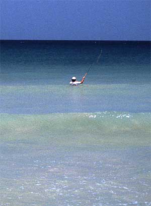 Ich sitze am Strand und beobachte ein atemberaubendes Szenario... zwischen hunderten von Pelikanen, Möwen und Seeschwalben, die immer und immer wieder ins Wasser stürzen, erblicke ich rollende Poons. (Übrigens spricht man den Kosenamen "Puun" aus.) Die Tarpon sind überall. Sie folgen den Brutfisch-Schwärmen und rauben, dass es nur so knallt. Da gibt's kein Halten, wenige Sekunden später stehe ich bis zum Bauch in den Wellen und knall die Fliege raus. Platsch - Pelikan von oben. Wooschhhh - Tarpon von unten. Ich krieg die Krise. Wo soll ich zuerst hinwerfen? So, jetzt ist die Fliege zwei Meter vor dem Fisch. Blosch, drei Meter rechts von mir sehe ich eine gigantische Schwanzflosse abtauchen. Mehrere Würfe sind optimal platziert, aber die Poons wollen meine Fliege nicht. Blau-Weiß scheint nicht angesagt zu sein. Also, mal ein anderes Muster ausprobieren. Schon der zehnte, oder war's der elfte? Wurf bringt den ersten Fischkontakt. Es reißt mir fast die 10er Rute aus der Hand, als der Fisch einsteigt. Ich schlage an. Der Ozean öffnet sich und ein silberner Gigant schraubt sich vor mir in den tiefblauen Himmel. Heilige Schei... Als der Fisch auf dem Wasser aufschlägt bekomme ich eine heftige Dusche. Ich stehe da wie hypnotisiert. Anschlagen! schreit ein Männlein in meinem Unterbewußtsein und rüttelt mich wach. |