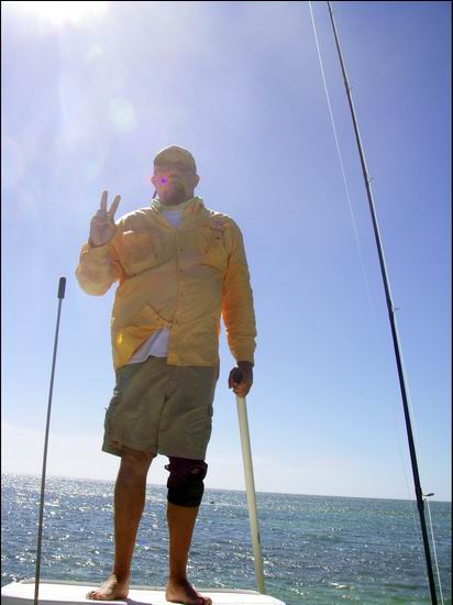 Er sagte dem Guide, das er gerade ein paar Tarpon's - nicht weit vom Strand - schwimmen gesehen hatte. Wir ankerten sofort, und sahen tatsächlich den Schwanz eines etwa 30kg schweren Tarpon's, der wie ein Bonefish im seichten Wasser nach Nahrung suchte. Der Guide vermutete, dass wahrscheinlich ein Fischerboot kurz zuvor Netze gereinigt, und so die Tarpons angelockt hatte. Über eine Stunde lang versuchten wir die Tarpons, die etwa fünf Meter vom Strand entfernt waren, mit Streamern zu fangen. |