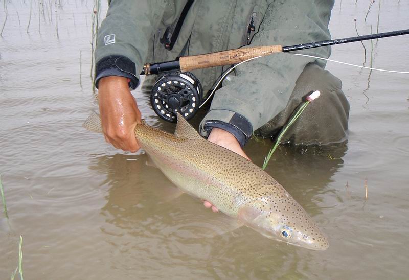 Nun, das Gelee war eingekocht, die Schichten von Fleece und Watjacke plus warmer Mütze angelegt, so machten wir uns wieder auf den Weg zum Wasser. Ich hatte meine #4 Rute gegen eine #5er eingetauscht und Carolina blieb bei ihrer 5er Gerte. Wir wählten nun einen anderen Bereich der Bucht, der Seeboden hier war firm und frei von lästigem Sediment. Wir hatten einen anderen Antagonisten ausgesucht: Die kampfstarken Regenbogenforellen, die Laichzeit war vorrüber und ungleich des Runs im nahegelegenem Fluss und der Leichtigkeit eine dieser Schönheiten zu haken, sind nun Ausdauer und Geduld gefragt, um diesen Fisch zu fangen. Aufgrund des Wasserstandes war die Distanz vom Ufer zum Steilabfall im See beträchtlich. |