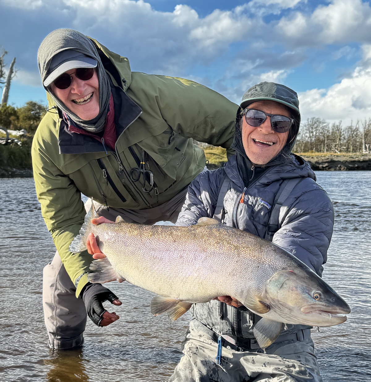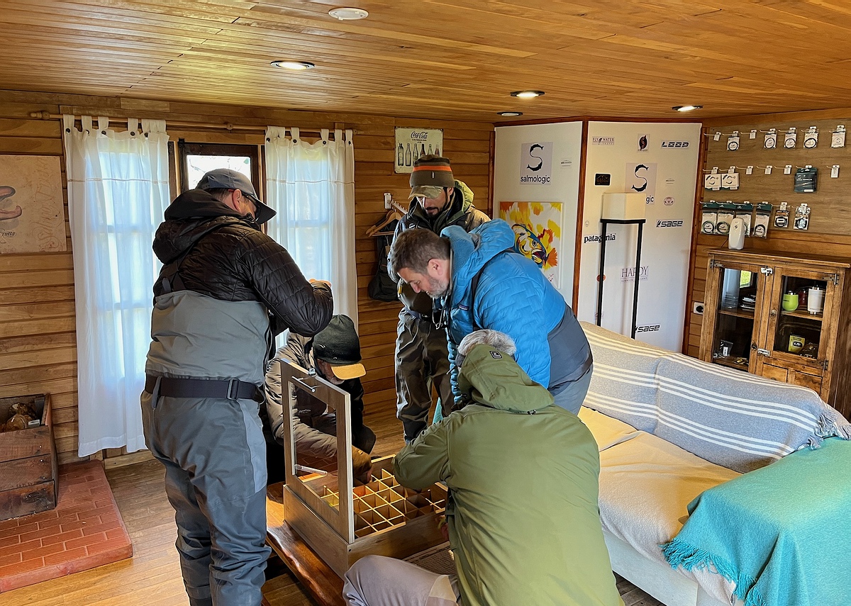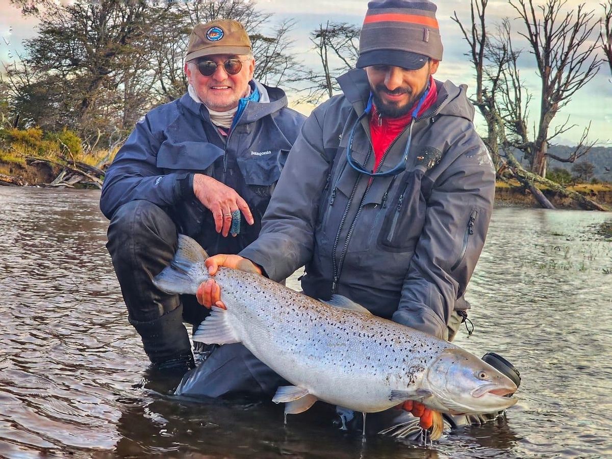 Am ersten Tag fangen alle ein paar kleinere Fische, am nächsten Tag landen wir die ersten „richtigen“ MeFos, für die Feuerland so berühmt ist. Volkmar landet einen Fisch mit 87cm, der der Fisch der Woche sein sollte. Ich erinnere mich an das Befischen eines Pools, beim stromauf-Schauen sehe ich einen Fisch an einer Stelle rollen, die wir sonst nie befischen. Am nächsten Tag sage ich Exe, dem Guide, dass ich dorthin möchte, einfach aus einem Bauchgefühl heraus. Exakt an der Stelle des Rollers nimmt ein großer Fisch meine Fliege, leider verliere ich ihn nach kurzem Drill. Besonders ärgerlich, wenn die Chancen auf wenige am Tag beschränkt sind. In den kommenden Tagen bleibt die Fischerei herausfordernd, wir probieren viel - unterschiedlichste Muster, verschiedene Zeiten (keine Mittagspause, länger am Abend fischen, Nebenfluss Malenguena, Oberlauf Irigoyen), wir fangen Fische, aber nicht so wie die Gruppe in der Vorwoche. Am Ende haben drei von den 4 Gästen einen Fisch über 80cm gelandet. Ich drücke dem letzten der vier bis zum Schluß die Daumen, er fischt super, und hätte eine großen Fisch mehr als verdient. Er bekommt Chancen, doch leider bleibt am Ende kein großer Fisch für ihn hängen. Am Freitag morgen um 06 Uhr