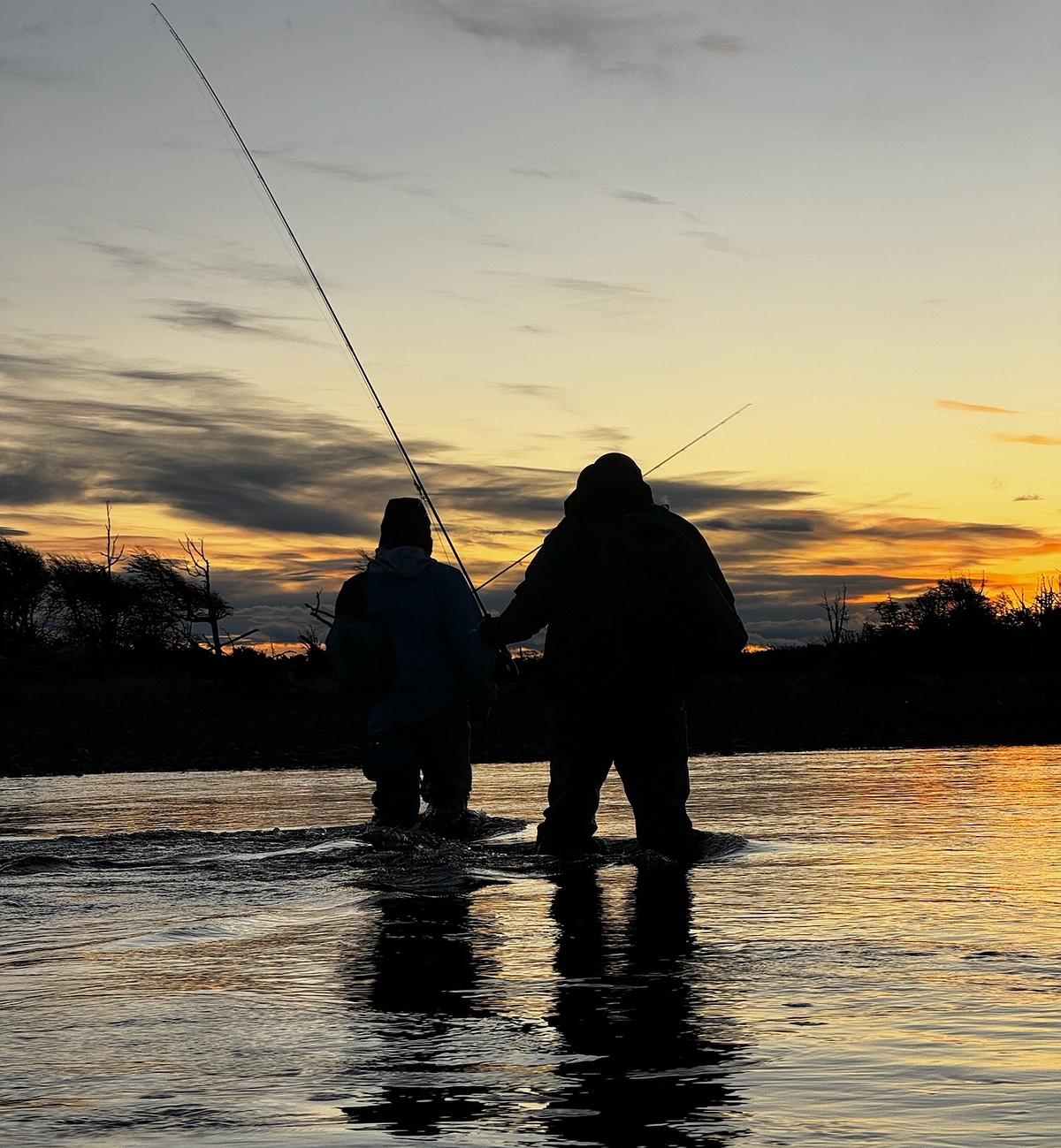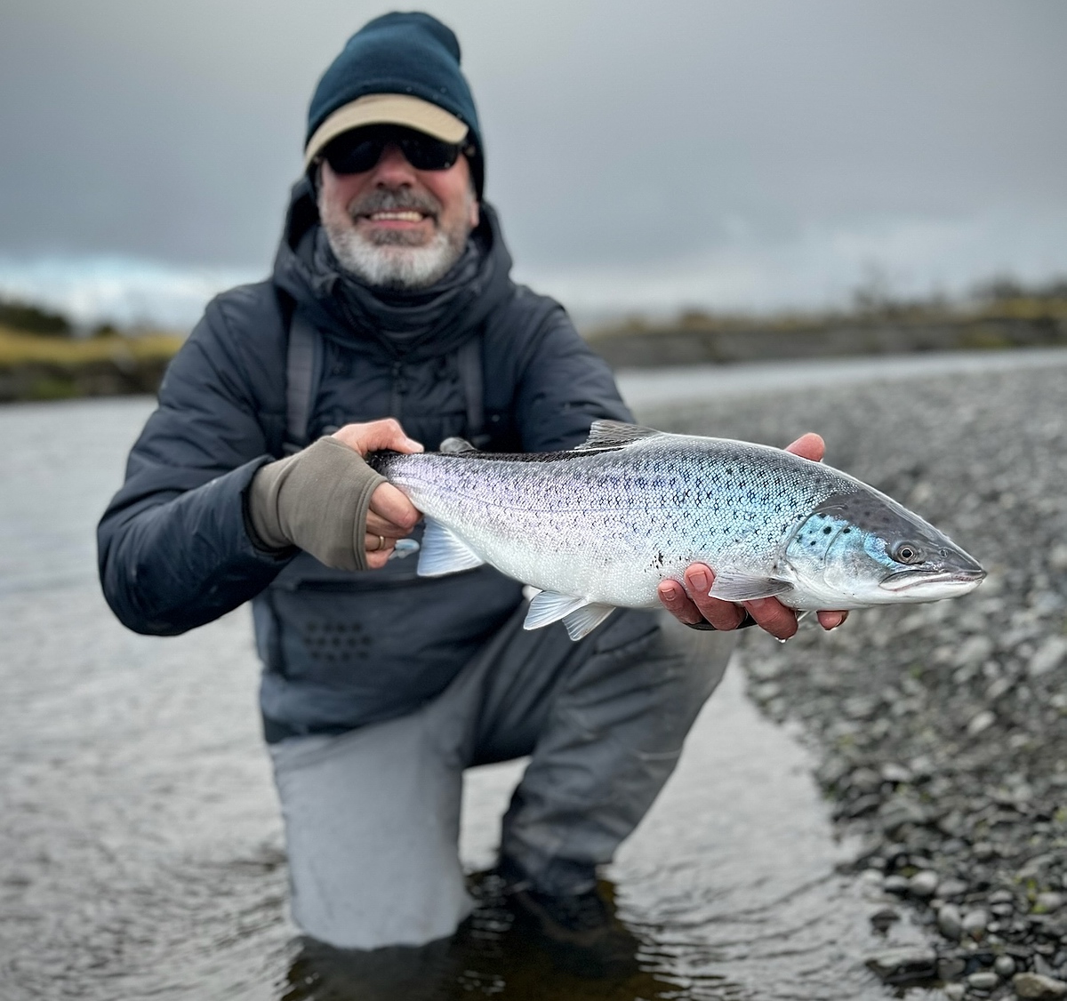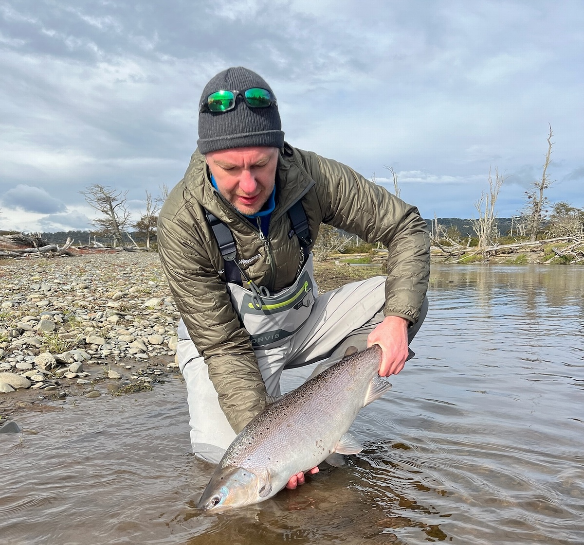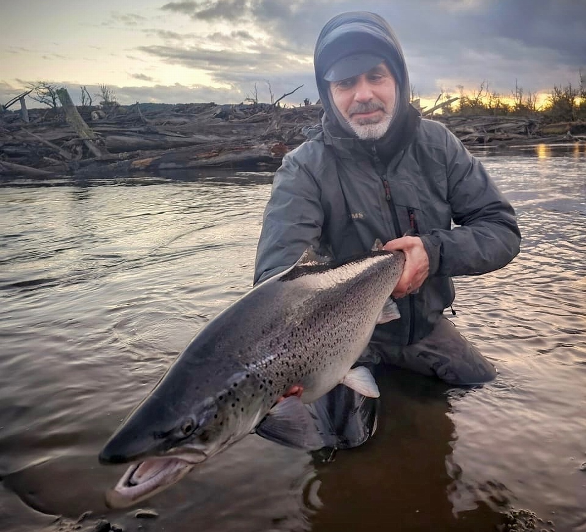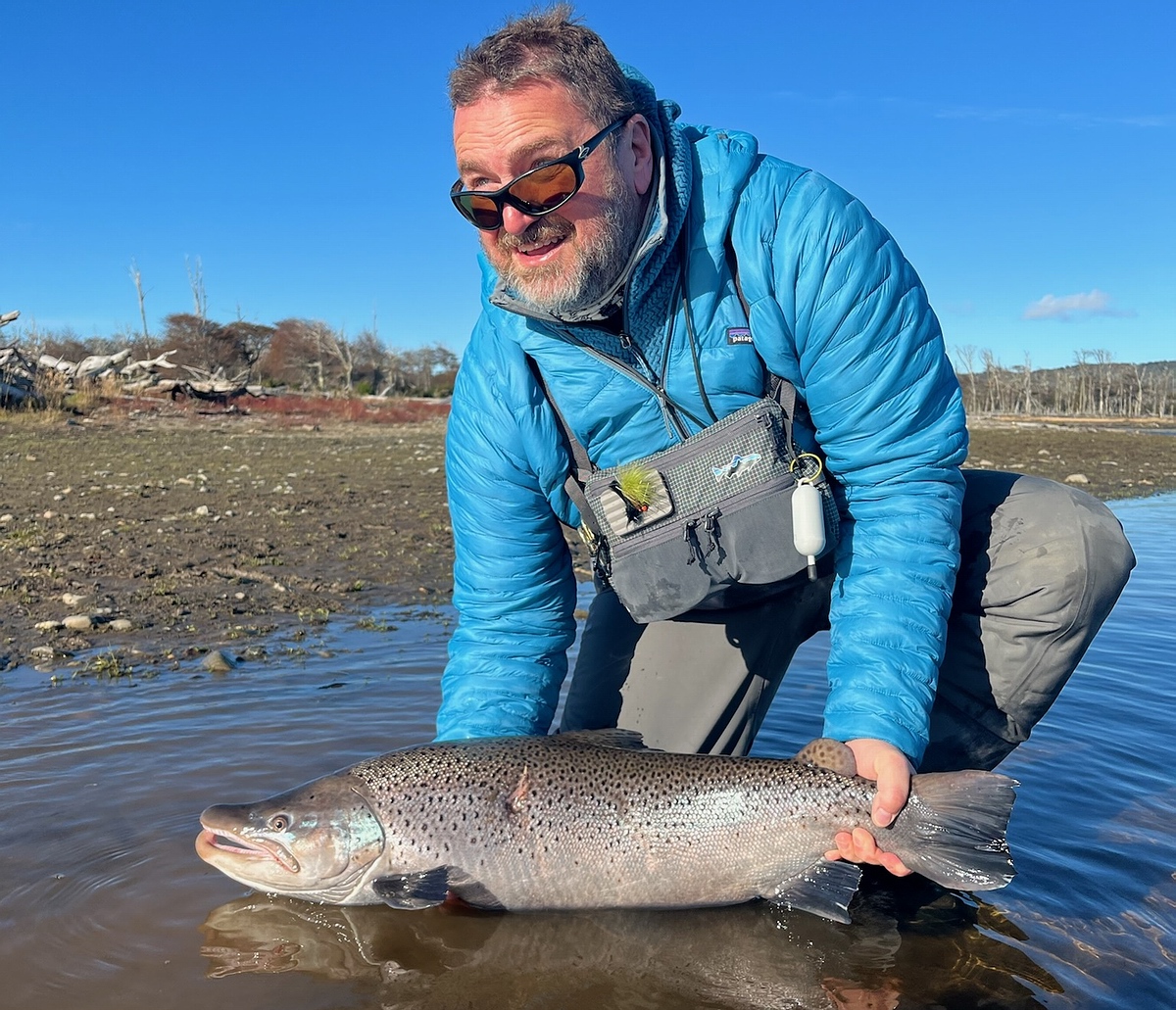 Dienstag, der 19. März! Es ist kalt, die Ruten sind mit Raureif bedeckt. Aber die aufgehende Sonne macht der Kälte schnell den Garaus. Wir fahren wieder raus zum Wasser. Der Irigoyen fließt ruhig und gelassen wie immer. Ich mache mich ans Werk. Der grüne Wooly Bugger fliegt mehrmals schräg stromab zum anderen Ufer und tritt dann die Reise zum Swing an. Mehrmals durchschneidet die Schnur das Licht der Morgensonne! Ich freue mich über meine gelungenen Würfe und deren nahe Platzierung am Ufer, dann ein Stopp, ein Klopfen. Da ist er, der Einschlag des Monsters! Mein Puls steigt rasant- und die Spannung ins Unermessliche! Endlich, endlich habe ich einen dicken Fisch an der Angel! Und groß ist der! Zunächst lässt er sich gar nicht blicken und ich muss ewig kämpfen, bevor ich ihn das erste Mal sehe. Unser Guide ist nervös, er wusste wohl, dass das ein besonderer Fisch ist. So geht der Kampf gefühlte 10, oder 20 oder vielleicht 30 Minuten, bis er ans Ufer kommt zum beachen. Dachten wir, aber eine erneute Flucht verlängert meine brutale Anspannung nochmals. Beim zweiten Anlanden ist es so weit, unser Guide ergreift das Beast in erfahrener Manier und wir haben ihn gelandet. In mir löst sich der Urschrei, den wohl noch die Einwohner der 300 km entfernt gelegenen Falkland Inseln gehört haben müssen. Ganze 85 cm lang und mega fett ist diese gigantische Meerforelle. Da liegt er, der Fisch meines Lebens! Was für ein wunderschönes Tier. Nach ein paar Aufnahmen und Vermessen darf der Fisch wieder in seine Freiheit des dunklen Wassers des Irigoyen entschwinden. Die nächsten zwei Tage