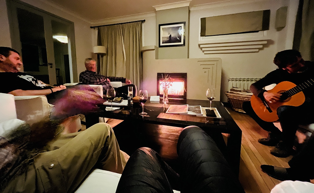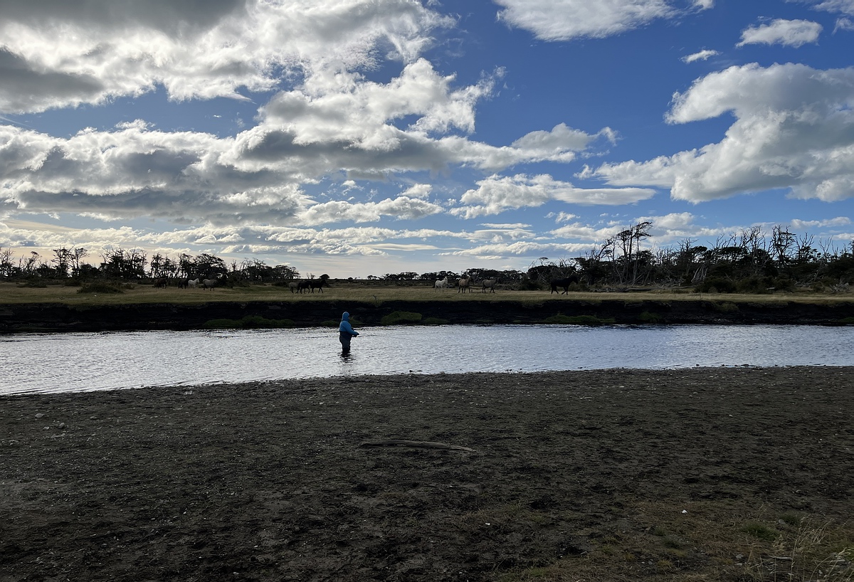 <Roberto> Habe ich erwähnt, dass Carsten noch bei der Einweisung um 1 Uhr in der Früh meint, wir wollen schon in der Früh raus zum Fischen? Das habe ich dankend abgelehnt und signalisiert, dass ich dann am Nachmittag mitgehe und erst mal ausschlafen möchte und alles in Ruhe herrichten. Später stellt sich heraus, dass das wohl die richtige Entscheidung war. Das Morgenlicht küsst mein Zimmer, als ich nach einem erholsamen Schlaf aufwache. Ich sehe mir das Zimmer noch einmal in Ruhe an. Es ist klassisch, aber trotzdem geschmackvoll für eine Lodge, alles aus Holz, mit integrierten Regalen und viel Platz für meine Ausrüstung. Das Bad ist geräumig und kuschelig warm. Also zunächst eine Dusche nehmen und dann sehen wir weiter. Im Vorraum der Lodge brennt der Holzofen und so kann ich meine Ausrüstung in Ruhe bei einem gemütlichen Feuer und einer Tasse südamerikanischem Kaffee herrichten. Der Blick nach draußen durch die großen Fenster beeindruckt durch eine grandiose Landschaft, die vom gelben Morgenlicht der aufgehenden Sonne geflutet wird. Also nichts wie raus und in den Aufenthaltsraum der Lodge mit der angeschlossenen Küche, um das hervorragende Frühstück mit Ausblick auf ein Land aus vergangener Zeit zu genießen. Meine Entscheidung, den Vormittag vorerst auszuruhen, war goldrichtig. Ich nutze die Zeit, um meine Ausrüstung akribisch herzurichten und die Umgebung der Lodge mit meinem Fotoapparat zu erkunden. Und so spaziere ich in der argentinischen Sonne die Mündung des Irigoyen bis zum Meer hinunter. Auf meinem Weg treffe ich auf einen Caracara, einige Wildpferde und Guanakos und natürlich jede Menge anderer Vögel. Am Meer angekommen genieße ich den grandiosen Blick auf die Küste des Atlantiks bis hinunter zur Spitze des südamerikanischen Kontinents, die nur noch ca. 60 Kilometer entfernt war. Beim Anblick der Wellen des Atlantiks, die den Strand umarmen, fließen meine Gedanken in die Vorstellung, was wohl all die Seefahrer gedacht haben, die diesen Kontinent das erste Mal nach einer langen Überreise sahen. Ich genieße gerade die Mittagssonne, als die anderen von ihrem ersten Angelabenteuer zurückkehren. Leider war der erste Morgen nicht von Erfolg gekrönt, was meine Entscheidung bestätigte, alles etwas ruhiger angehen zu lassen. Wir nehmen über Mittag eine Stärkung in der Lodge zu uns und dann geht es los, mein erstes Angelabenteuer am Rio Irigoyen. Am Samstagnachmittag ist es dann so weit. Ich stehe mitten im Fluss am Two Colours Pool und mache meine ersten Würfe im Dunklen, aber klaren Wasser. Umsäumt von Kiesbetten, Baumstümpfen, Gräsern und Büschen und alten Bäumen schlängelt sich der Fluss durch diese wundervolle Landschaft. Welch sagenhaften Fischreichtum er wohl vor mir verbirgt? Am heutigen Tage wird er mir sein Geheimnis nicht mehr preisgeben und so bleibt mir nur der traumhafte Anblick der Wildpferde, die im Mondlicht am Ufer grasen, während wir bis in die Dunkelheit unsere Ruten schwingen und immer wieder das laute Klatschen eines rollenden Fisches vernehmen. In der Lodge angekommen gibt es ein wunderbares Abendessen mit einem ebenso im Geschmack schmeichelnden Malbec und zum Nachtisch eine Birne Helene oder so etwas Ähnliches, von dem ich nicht wusste, ob ich es lieber nur ansehen soll oder auch essen, so schön war das Arrangement des Desserts. Sonntag, der siebzehnte März,