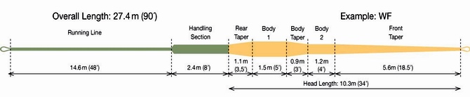 | Art / Aufbau: | Ab Schnuranfang (0,91 mm Durchmesser) steigt der Schnurdurchmesser zunächst sanft, im letzten Drittel stärker bis auf Maximalwerte von 1,66 mm an, welche bei Schnurmeter 8 erreicht werden. Dann folgt ein rd. 2 m langes Rear Taper mit Durchmesserrückgang auf 1,02 mm, daran schließt sich eine rd. 3 Meter lange Handling Sektion an, an deren Ende der Durchmesser nochmals auf 0,94 mm zur Runningline abfällt. Der Schnurdurchmesser der Hauptkeule wirkt für Schnurklasse #6 sehr kräftig. |