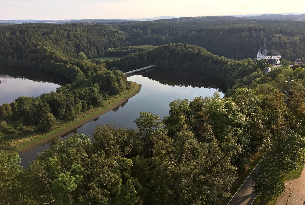 von Aussichtsturm Burgk auf den Stausee Burgkhammer mit Schloss Burgk,