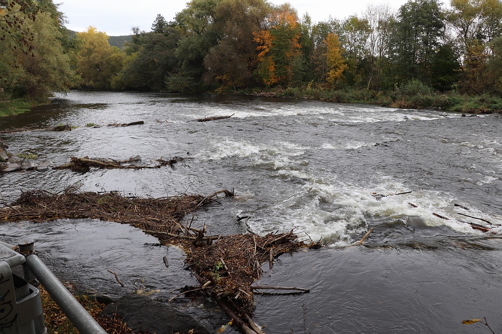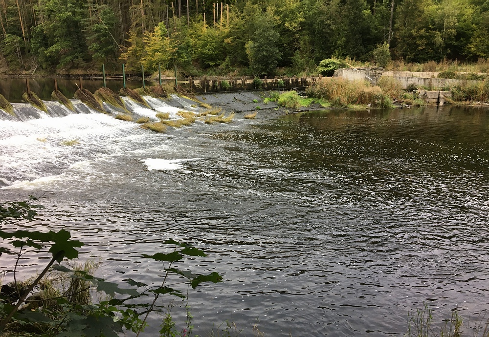 | Die Strecke beinhaltet auch mehrere Stauwehre mit Wasserkraftwerken und Ausleitungsstrecken. Während eines der Wehre (die Volkstedter Rampe) hier wie auch schon in Saalfeld vorbildlicherweise im Jahr 2020 zurück gebaut wurde, gibt es an anderen Stellen noch Handlungsbedarf. |
