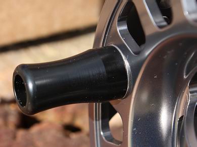 Attraktive Großkern-Fliegenrolle aus hochqualitativen 6061 T6 Aluminium, aus dem vollen Block gedreht und gefräst, salzwasserfest vergütet und mit fein einstellbarer Bremse. Ansprechendes, modernes Design und zeitgemäß schöne Farben (drei verschiedene zur Auswahl, s.o.). Die Spule der 4280 läuft auf einem mehrfach gelagerten Achsensystem im offenen Rollenrahmen, unter sehr guter Gehäuseplatzausnutzung und mit einer bis auf fünf schmale Stege offenen Gehäuserückseite. Die zwei Stege des Rollenrahmens greifen sauber und tief in die entsprechende Nut auf der Spuleninnenseite hinein: ein breiter, mehrfach gelochter Steg hinten, an dem sich der zweifach von Innen geschraubte Rollenfuß befindet und ein schmaler Steg vorne mittig für die Schnurführung. Ein ungewolltes Durchrutschen von Schnur oder Vorfach zwischen Rollenrahmen und Spule wird durch die Bauweise wirkungsvoll verhindert. Die 4280 Rolle ist von Links- auf Rechthandbetrieb bzw. anders herum umbaubar (beschrieben im "Owner's Manual" in englischer Sprache). Die Spule wurde auf der Vorder- und Rückseite zwecks Gewichtseinsparung und Belüftung dicht mit großkalibrigen Durchbrüchen versehen. Sie besitzt einen leicht übergreifenden Rand, um bei Bedarf eine zusätzliche Handbremsung zu ermöglichen. Der Spulenkern ist bis auf ein "Y" ebenfalls offen, der Spulenboden ist konkav geformt und ungelocht. Die Kurbel aus Kunststoff ist leichtgängig, ohne Spiel und griffig, ihre Form wirkt einem Abrutschen der Finger entgegen. Ihr gegenüber wurde ein Kontergewicht angebracht, welches mit für einen 100%ig "schlagfreien" Spulenlauf sorgt, auch bei hohen Abzugsdrehzahlen. Die kugelgelagerte Spule läuft seidenweich und toleranzfrei, bis auf ein äußerst geringes und daher unbedeutendes vertikales Spiel der Spule wackelt, schleift, klappert absolut nichts an der Rolle. Alle Ecken und Kanten der kompletten Rolle wurden sorgfältig abgerundet. |