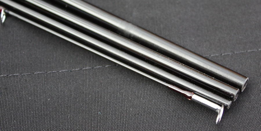 Teilung und Maße: Vierteilige Fliegenrute, Länge 10'0" (zusammengesteckt und nachgemessen 304,5 cm), vier bis auf wenige Millimeter gleichlange Teile um 80 cm. Das Gewicht der Rute beträgt 74 Gramm. Blankdurchmesser über dem Griff: 8,5 mm, Blankdurchmesser an der Rutenspitze: 1,4 mm. Länge Transportrohr: 83,5 cm, Gewicht Transportrohr (leer): 409 Gramm. Ausstattung: Schlanker, schwarzer, glanzlackierter Blank aus hochmodulierter Kohlefaser (KonneticHD Technologie). Die Verbindungen der Einzelteile wurden als exakt passende Überschubverbindungen ausgeführt, die oberen Enden der Ruteneinzelteile wurden gegen das Eindringen von Schmutz und Wasser abgedichtet. Beringung: Handteil ohne Beringung und ohne Fliegeneinhängeöse, zweites Teil mit einem gefütterten Fuji Dreibein-Leitring und zwei Einstegringen, drittes Teil mit drei Einstegringen, Spitzenteil mit fünf Einstegringen und dem Spitzenring. Alle Ringe besitzen der Schnurklasse angemessene Durchmesser und Materialstärken, sie wurden hartverchromt und weisen die nötigen Abstufungen auf. Die Ring- und Zierbindungen wurden in tief Dunkelrot und Halbtransparent ausgeführt, an den Übergängen der Einzelteile und am Handteil gibt es zudem Zierwicklungen in Metallic-Grau. Alle Bindungen wurden sauber (reichlich) lackiert und gründlich versiegelt. |