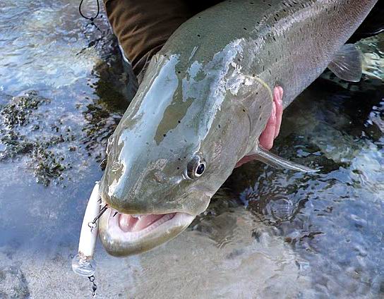 Wie am Vortag fischen wir uns über mehrere Stunden gerade mal ein paar hundert Meter den Fluß hoch. Emil fischt auch mit Gummifisch und Wobbler grundsätzlich flussauf. Es ist bei diesem kleineren und sehr klaren Fluß sehr viel unauffälliger. An manchen Stellen stippt man wie am Bergbach mit der Nymphe in tiefe Gumpen und Kehren rein – allerdings mit einem mächtig schweren Gummifisch. Wo das hinführen kann, zeigt ein Film auf Emils Website. Und auch am zweiten Tag spielen wir natürlich wieder das „Da! Wo? Na da!“-Spiel. Abzüglich der sechs Huchenmodels an der großen Brücke (sehen gut aus und stehen blöd rum) spottet Emil sechs Huchen. Und wenn man dann mal erleben darf, wie ein Meterhuchen 10 Meter vor einem plötzlich deinem Wobbler hinterher geht, dann vergisst man ganz schnell den schmerzenden Hintern. Doch er beisst nicht zu. Gegen Nachmittag darf ich dann den ersten richtigen Biss spüren. Ein harter Schlag, das war’s. Noch auf dem Weg zurück beruhige ich Emil, der wirklich alles daran setzt, mir meinen ersten Huchen zu bringen. |