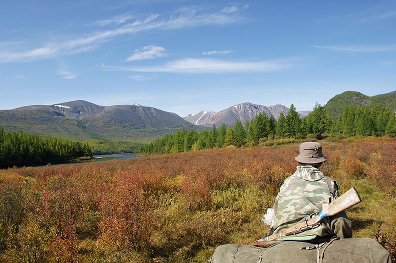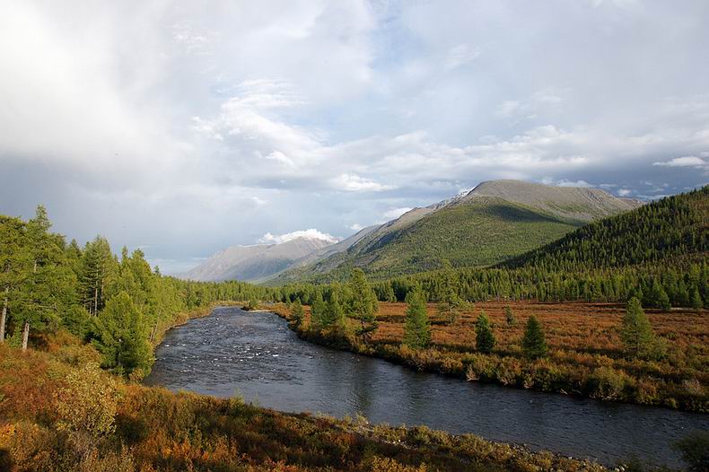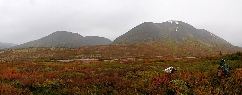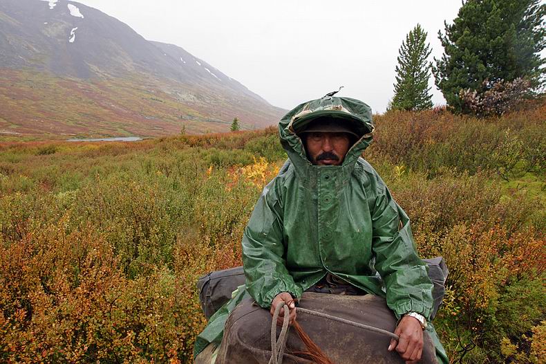 Am Abend kommen Aleksej und Zseseren zu Pferd nach, leider nur mit vier Gäulen. Wir sind skeptisch, ob diese vier Reiter samt Boot, Gepäck und Proviant für drei Wochen über die Berge tragen können. Doch keine extra Tragpferde zu verwenden, erweist sich als richtige Entscheidung: Die Reitstrecke entpuppt sich als Hindernis-Parcours par excellence. Dichtes Gestrüpp, eng stehende Baumstämme, zahllose steile Böschungen und tiefe Furten sowie lange sumpfige Abschnitte behindern das Vorwärtskommen und hätten beim Nachführen von Packpferden große Probleme bereitet. Den ersten Reittag erleben wir als Leistungsschau der buryatischen Pferde: Die frischen Tiere halten in gestrecktem Marsch bis zur Finsternis durch, sodass wir mehr als die Hälfte der Strecke bereits am ersten Tag schaffen. Die Landschaft hier im Hochgebirge erweist sich trotz des schlechten Wetters als märchenhaft schön, zwischen den Wolken blinzeln weiße Gipfel (z.B. der nahe Munku Sardik mit 3491 m) durch. Wir reiten zuerst durch Nadelwald, teils flussbegleitende Moore und lichte Lärchen bis hinauf in die hochalpine Tundra, wo rot verfärbte Zwergbirken, vereinzelte Zirben und sich flächig ausbreitende Rentierflechten wunderschöne Farbkontraste bilden. |