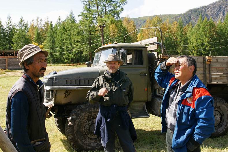 Zurück in Irkutsk treffen wir den Pensionisten Aleksej, der uns weiter bis ins Sayangebirge begleiten wird. Er gehört dem buryatischen Volksstamm an, der eng mit den Mongolen verwandten Bevölkerung der Gegend um den Baikal. Zuerst legen wir 400 km Straße von Irkutsk über Sljudjanka am Südende des Sees, das Tunka-Tal mit breiten Wiesen und Dörfern typischer buryatischer Holzhäuser bis an den Rand des Gebirges zurück, wo schneebedeckte 3000er und das rauschende, glasklare Wasser des Irkut-Flusses alpines Flair verbreiten. Direkt vor der mongolischen Grenze folgen wir einer nach West abzweigenden Schotterpiste und über unbesiedelte Hochtäler und Pässe überqueren wir die Wasserscheide zum Oka-Fluss, bis wir im letzen Ort im Gebirge ankommen – Orlik. Gastfreundlich, wie die Buryaten sind, werden wir hier von Aleksejs Familie mit einem Willkommens-Ritus empfangen, bei dem eine Schale Milch getrunken und ein (unpolitisch) blauer Schal überreicht wird. In der Nacht werden wir mehrmals von Lärm im Hof geweckt. Am Morgen folgt die nächste Aufregung: Aleksej sorgt sich, ob unsere draußen verstauten Vorräte noch vollständig sind. Wir überprüfen das und finden alles vor, nur ein Laib Brot ist abhanden gekommen. Scharfsinnig schließt der Buryate erleichtert, beim nächtlichen Störenfried müsse es sich um einen Hund und keinen Zweibeiner gehandelt haben, weil der Wodka noch da ist, das Brot aber fehlt. Hinter dem Holzhaus können wir bereits das monströse Gefährt bewundern, mit dem die Reise am nächsten Tag weiter geht: Es handelt sich um einen alten, dreiachsigen LKW mit groben, gut einen Meter hohen Stollenreifen. Verbrauch: 100 Liter auf 100 Kilometer! Dass der Einsatz dieses wilden Fahrzeugs mehr als angebracht ist, zeigt sich, als wir gleich am Anfang die Oka auf einer hundert Meter breiten und über weite Strecken mehr als einen Meter tiefen Furt durchqueren. Weiter führt die Route den ganzen Tag das Tal des Tissa-Flusses stromauf, wobei großteils das Flussbett als „Strasse“ benutzt wird, um dichtem Wald oder Sumpf auszuweichen. Vereinzelt liegen hier auf 1400 m Seehöhe noch Gehöfte, die – ähnlich wie die heimischen Almen – im Sommer zur Rinderzucht bezogen werden. Viele Stunden später erreichen wir die letzte menschliche Ansiedlung: Der hier mit seiner Familie lebende Buryate Zseseren wird uns mit seinen Pferden bis zum Ausgangspunkt unserer Bootstour über die Berge begleiten, wofür drei Tage veranschlagt sind. Der LKW-Fahrer bringt uns noch zwei Fahrstunden weiter stromauf, wo wir beim Ausfluss des wunderschönen Gebirgssees Schuchtalai Nuur übernachten. |