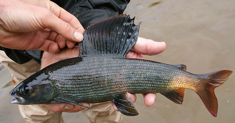 Und tatsächlich, bei den Äschen hier im Belin Chol handelt es sich unzweifelhaft um diese wunderschöne, neue Art. Nicht nur der goldgelbe Schwanzstiel, auch weitere Merkmale wie die „bulligen“ Proportionen (große Höhe von Kopf und Rumpf im Verhältnis zur Körperlänge) oder die Zahl von mehr als 5 Fleckenreihen auf der Rückenflosse unterscheiden die „Gelbschwanzäsche“ von anderen Formen. |