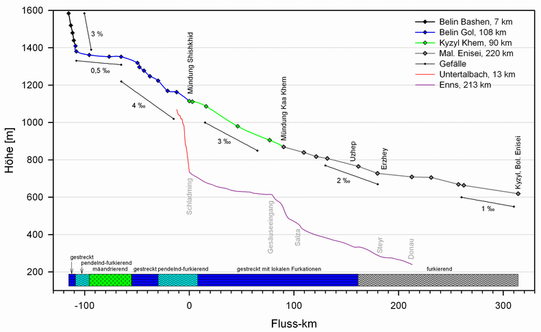 In Bezug auf Bootstouren war mein Heimatland Österreich ursprünglich ein Paradies. Stellt man sich die Schönheit der Flüsse samt umgebender Landschaft und die historisch beschriebenen Fischbestände der Fließgewässern vor, so würden sich lange Bootsfahrten mit der Angelrute an Bord förmlich aufdrängen. Beispielsweise über das Salzachtal nach Bischofshofen, über die Wasserscheide nach Radstatt an der Enns (Anm.: Grenzfluss zwischen Ober- und Niederösterreich, mündet stromab von Linz in die Donau), und dann über das steirische Ennstal mit seinen riesigen Mäandern bis Admont; die wildesten Stromschnellen des Gesäuseeingangs umtragen, vor beeindruckendem Bergpanorama weiter bis zur Salza und über die tiefen Schluchten der mittleren Enns bis zur Mündung der wunderschönen Steyr; weiter über die Aulandschaft der unteren Enns bis an die Donau; bei entsprechend Zeit weiter über das Machland und die Durchbruchsstrecken des Strudengaues und der Wachau bis hinunter nach Wien. Ein unbezahlbares Erlebnis, doch heute ist zu befürchten, dass derartige Unternehmungen mit Ausnahme der Fließstrecken im Gesäuse und in der Wachau als Frust-Erlebnis enden: Durchstochen die Mäander, monoton reguliert das obere Ennstal; fast die gesamte mittlere und untere Enns und die Donau eine Staukette; statt Schotterbänken mühsam zu überwindende Rückstaubereiche von 15 Kraftwerken allein an der Enns; ein danieder liegender Fischbestand auf der ganzen Strecke. Umso interessanter ist es, Orte zu erkunden, wo sich eine derartige Zeitreise erübrigt. Wo man auch heute nicht nur intakte Flusslandschaften genießen kann, sondern daran erinnert wird, was in der Heimat als Tribut an ein einseitiges Fortschrittsideal verloren gegangen ist. Und wo beim Schutz und der Restauration der Gewässer anzusetzen ist. Der Süden Sibiriens liegt auf ähnlicher geografischer Breite und Seehöhe wie Mitteleuropa, unterscheidet sich wesentlich aber hinsichtlich des kontinentalen Klimas, einer entsprechenden Hydrologie und diesbezüglich abweichende Habitatbedingungen für Flora und Fauna. Trotzdem findet man hier Gewässersysteme, die einen ganz ähnlichen Wechsel charakteristischer Flussabschnitte wie beispielsweise an der heimischen Enns bieten. In dieser Hinsicht stellen Oberläufe des Jenissei – in weiterer Folge des größten Stroms Sibiriens – ein spannendes Ziel dar. Hier, im Grenzland zwischen den Autonomen Russischen Republiken Buryatien und Tuwa sowie der Nordmongolei findet man eine ethnisch, landschaftlich und naturgeschichtlich enorm interessante Wildnis. Im schwer zugänglichen Ostsayangebirge leben die letzten Familien kleiner Volksstämme wie Tofolaren, Sojoten oder Zsaatan, die sammeln, jagen und im Gebirge auch auf dieser gemäßigten Breite Rentiere züchten. Das Gebiet ist auf dem Landweg am „leichtesten“ von der buryatischen Seite im Westen des Baikalsees erreichbar. Mein Plan ist die Überquerung des Gebirges zu Pferd bis zu einem Bergsee auf der unzugänglichen tuwinischen Seite. Von dort fließt der Fluss Belin Gol parallel zur mongolischen Staatsgrenze bis zum Oberlauf des Kleinen Jenissei, der mit dem Boot weiter bis in die tuwinische Steppe befahrbar ist (siehe Karte im ersten Teil). Möchte man die Analogie zur Enns noch einmal bemühen, so würde die Tour einer Überquerung der Niederen Tauern zu Pferd von Tamsweg im Lungau aus entsprechen, um die Bootstour nach dem Riesachsee und den Riesachfällen zu beginnen und weiter den Untertalbach und die Enns bis hinunter zur Donau zu paddeln. Besonders reizvoll – gleichermaßen bei der virtuellen Enns-Befahrung als auch bei der realen Tour in Südsibirien – stellt sich der stete Wandel der Flusslandschaft dar. Der Flusstyp wechselt in Abhängigkeit von Gefälle, Abfluss, Geschiebe und Talform von gestreckten über pendelnde und verzeigte (furkierende) Gerinne bis hin zum Mäanderfluss. Der dargestellte Längenschnitt zeigt die Erstreckung unserer Bootstour in Höhe und Distanz. Die Steigung der Linie entspricht dabei dem Flussgefälle. In Summe erstreckt sich die Route auf fast 450 Flusskilometer über 1000 Höhenmeter. Bereits das mittlere Gefälle von mehr als zwei Promille (zwei Meter pro Kilometer Fluss) über die gesamte Strecke beeindruckt, es wird jedoch sehr ungleichmäßig abgebaut: Es erwarten uns auf 300 Kilometern und damit einen Großteil der Strecke verteilt immer wieder Stromschnellen des dritten und vierten Schwierigkeitsgrades. |