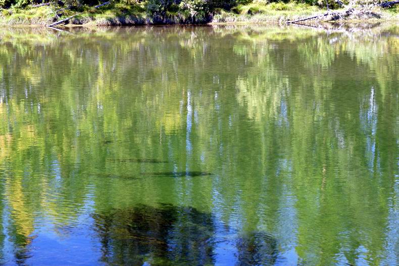 Dies könnte auch für den geringen Bestand adulter Taimen verantwortlich sein. Wir sehen in der Mäanderstrecke zwar einige, teils weit über einen Meter lange Exemplare, zu fangen sind sie hier aber nicht. Meist wird schon die Annäherung, spätestens aber das Aufplatschen des Köders an der spiegelglatten Oberfläche des kristallklaren Wassers mit Flucht oder desinteressiertem „in die Tiefe Gleiten“ quittiert. Weiter stromab sind Taimen trotz hoher Anstrengungen weder zu sehen noch zu fangen, wohl ist der Fluss hier zu rasch fließend und turbulent. Auch der Lenok (Sibirische Forelle, Brachymystax lenok) kommt anscheinend noch nicht vor. |