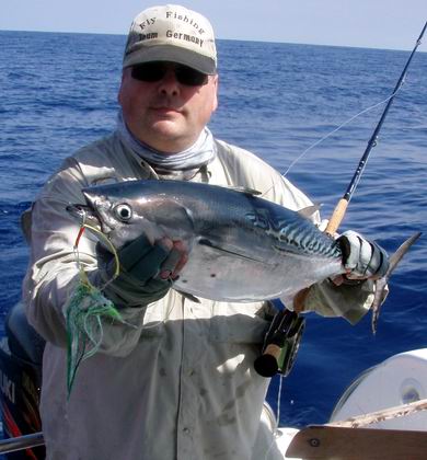 | Allzu viel Zeit verbrachten wir heuer jedoch nicht auf den Flats, denn nahezu täglich fuhren wir mit dem 500 PS starken Hochseeboot zwischen 5 und 9 Stunden lang auf den Indischen Ozean hinaus – zum Fliegenfischen auf starke Meeresräuber! Mit an Board war unser Fliegenfischer-Equipment im Wert von rd. 20000 Euro: um die 10 vollständig aufgetakelte Ausrüstungen a la Sage, Henschel, Abel, T&T, Loop u.a. Mit den bei dieser Fischerei üblichen Big Game Methoden lockten wir Thunfische, Dorados, Wahoos und Sailfisch in Wurfweite ans Boot – und dann kamen in vorher ausgeloster Rangfolge unsere „Fisherman“ am meistens #12 Gerät zum Wurf & Drill. Ein gutes System, bei welchem jeder mehrfach an der Reihe war und alle Mann einen intensiven Drill- und Fangspaß hatten. |