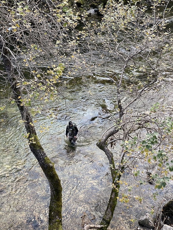 Hier standen ab der Brücke einige dutzend richtig kampfstarke Regenbogenforellen. Ich pirschte mich vorsichtig von Fluss abwärts an, mit einem Abstand von über 50 m. Im Flachwasserbereich konnte