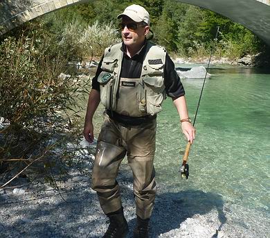 | Es geht wieder an die Mündung der Trebuscica. Andreas will mit dem geschenkten Koppenstreamer die Forellen, lauter Lackel, überlisten. Wir drei anderen beangeln die Mündung von der Idrijca aus. Vorweg: die Fische haben Andreas´ Streamer nicht mal angeschaut. Ob voller Euphorie oder Missmut geht Bernhard die Idrijca flussabwärts. Währenddessen stellen wir fest, die Fische steigen an die Oberfläche. Also Umrüsten von Nymphe auf Trockenfliege, bzw. Aufsteiger. Die Fische stehen wie immer auf der anderen Seite des Flusses. Weitwurfkünste sind gefragt. Es tut sich dennoch nichts, wahrscheinlich falsches Muster. Plötzlich ein Aufschrei von Andreas und Lambe. Sie sehen, wie die reißerische Strömung Bernhard beim aufwärtswaten die Beine wegreisst. Die Z-Axis nicht loslassend, greift er mit dem verbliebenen Arm gerade noch einen überhängenden Ast und kann sich an ihm ans Ufer ziehen. Tropfnass, von den Zehen- bis zur Nasenspitze, trottet er das Ufer entlang, uns entgegen. Ein älterer Herr stellt sich ihm in den Weg und gibt nur „Black Ant“ von sich. Bernhard ist, ungewöhnlich für ihn, sichtlich genervt. Er lässt den Mann links liegen. Daraufhin nimmt dieser Kontakt mit Rainer auf. Ein Italiener ist er, stellt sich raus. Mit rudimentären Lateinkenntnissen kann sich Rainer mit ihm verständigen. | ![]() |