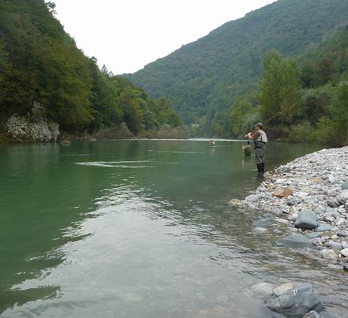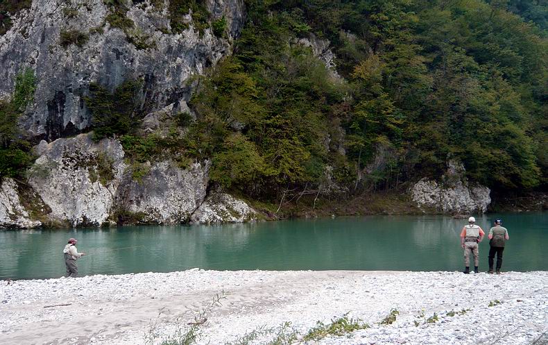 | ist. Das er das nur passiv, bzw. zahlend macht, tut den Umarmungen keinen Abbruch. Als Vorspeise gibt es leckere Käsestreifen mit Brot. Danach verschieden Sorten von Fleisch und Cevapcici. Letztere sind ehrlich umwerfend gut. Dazu wird lokales Bier und hauseigener Wein getrunken, sowie Andrea´s mitgebrachter schottischer Whiskey – der muss weg. Die Zigarren zum Schluss runden das Barbecue ab. Interessant sind die Gespräche. Es geht um die Marmorata, Bace meint, als Sportfisch ist sie für ihn nicht geeignet, da sie, in ausgewachsenem Stadium, ein reiner Räuber ist. Sie stellt sich in Gumpen für mehrere Tage unter und kommt nur sporadisch zum Rauben hervor. Es sollen schon Marmorata mit 12 kleinen Äschen im Bauch gefangen worden sein. Anglerlatein? Egal, eine zu fangen, wäre dennoch schön. Als die Zigarren ausgeraucht und der Wein ausgetrunken ist, gehen auch die letzten um Mitternacht zu Bett. |