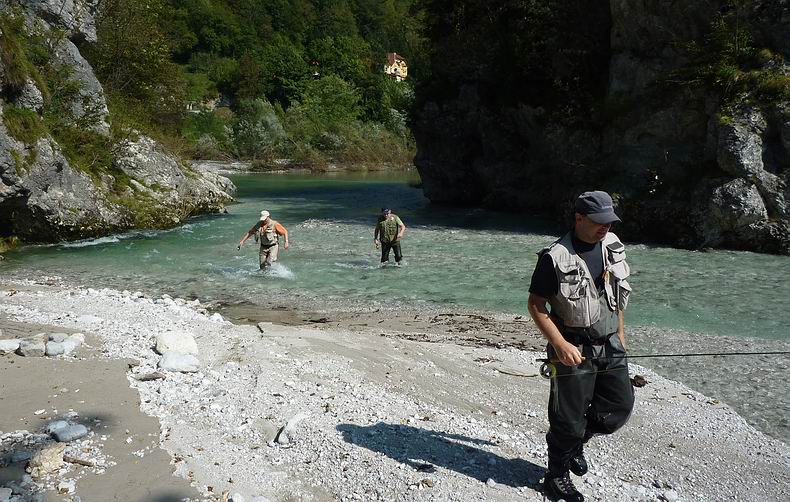 Um 03:00 Uhr morgens treffen wir uns alle bei Bernhard. Andreas hat Lambert mitgebracht und Rainer zu Bernhard gelotst. Dank Dachgepäckträger passt alles für vier Fliegenfischer in einen 3er BMW. Da Andreas Kosten sparen will, suchen wir in Österreich verzweifelt eine LPG-Tankstelle. Als wir endlich eine gefunden haben, stellen wir fest - es hat sich nicht wirklich rentiert, so teuer ist LPG im Nachbarland... Wir treffen gegen 10:00 Uhr an unserer Unterkunft, dem Appartementhaus BLAZAR in Volarje ein. Da die Ferienwohnungen noch nicht frei sind, besorgen wir uns gleich bei der „Agencija METULJ“ in Tolmin für zwei Tage „Catch and Release“ Angelkarten. Die Tageskarte kostet 52 € für das gesamte Revier des Fischereivereins Tolmin, und das ist wahrhaft riesig. Schon bei der Anfahrt stellen wir fest, das ein Fischen in der Soca nicht möglich ist, sie führt Hochwasser und ist milchig trüb. Ist aber keine Überraschung, da wir durch die Internetseite des Fischereivereins informiert sind. Wir weichen auf die Trebuscica aus, der südlichste Zufluss der Soca, da selbst die nachfolgende Idrijca Hochwasser hat. Die Trebuscica dagegen ist glasklar und hat einen normalen Pegel. Es wechseln sich Rieselstrecken und langsam fließende, tiefe Gumpen beherbergende Abschnitte ab. Leider geht unser erster Fischzug leer aus. Aber kein Wunder, Andreas ist mit Doppeltungsten unterwegs, Lambe hat keinerlei Fliegenfischererfahrung, Bernhard watet durch den Fluss so "wie eine Sau durchs Unterholz geht" und Rainer legt sich auf die Wiese zum chillen. |