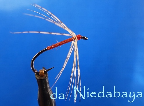 Haken: Daiichi 1180 # 12 Bindefaden: Ultra Thread 70 wine Rippung: Uni DBW Stainless SM 003 Körper: Bindefaden Thorax: Glasperle blau-opak ca. 2,5mm Flügel: 2 Jungle Cock Federn*) Hechel: indischer Hennenbalg hellbraun Sonstiges: MK-Wachs, Bindelack, alte Schere *) Die Verwendung von Jungle Cock oder genauer