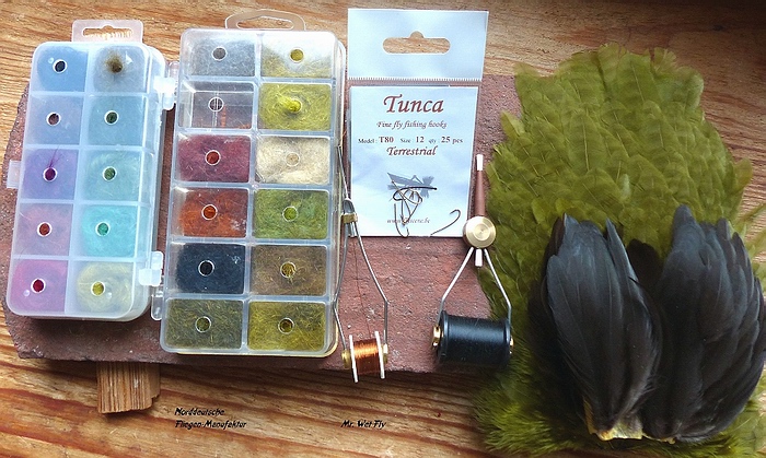 Haken: Tunca Terrestial #12 Schwänzchen: Mallard Flank oliv Körper: Antron Dubbing oliv Thorax: Squirrel Dubbing Light oliv Rippung: Kupferdraht Hechel 1: Whiting Hennensattel oliv Hechel 2: Whiting Hennensattel schwarz Bindefaden: Uni Thread 8/0 Bindeanleitung: |