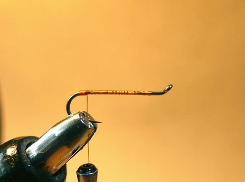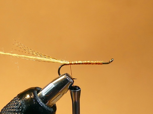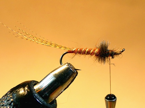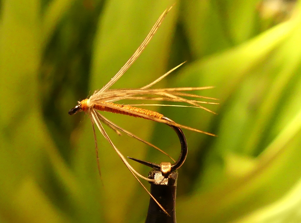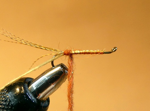 gerader Nymphenhaken Gr. 12-14 Pearsall's Gossamer Silk orange Bienenwachs Partridge/Rebhuhn Feder Bindeanleitung: |